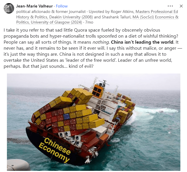 political aficionado & former journalist, Lives in Paris1987–present我想你指的是那个由明显的宣传机器人和痴心妄想的极端民族主义喷子推动的可悲的小Quora空间?人们可以说各种各样的话,这没什么。中国没有引领世界,它从来没有,而且这是否会出现还有待观察。我这么说并没有恶意,也没有愤怒——因为事情就是这样。中国并没有被设计来允许它超越美国成为“自|由世界的领袖”,也许它可以成为一个非自|由世界的领袖,但这听起来…有点邪恶?请注意,这并不意味着中国不会以各种方式“引领世界”。例如,中国是面部识别技术和其他人口控制手段方面的大师,它在这方面勇敢地“领跑”。虽然我不确定这是否是我想走的路,但这似乎非常反乌托邦......现在我们可以看看中国的经济。它有起有落,它很庞大,确实如此,但它在运行方式上算不上创新或绝顶聪明。人力是它们可用的最大的非秘密武器,但随着出生率的迅速下降,它们的适龄劳动人口每年都在以惊人的速度萎缩。印度等其他国家已经准备好接管所有的“廉价劳动力”职位,亚洲还有更多拥有受过良好教育和训练有素的人口以及大量求职者的大国——比如印度尼西亚、菲律宾、越南。如果你认真仔细地分析过中国目前在世界上的地位,就不难看出整个“世界领袖”的头衔是一厢情愿。走进任何一个房间,你都会自然而然地认为个子最高、块头最大的男人一定是最好的战士……中国可能是一条强大的龙,虽然它的牙齿很锋利,但这条龙却有着不为人知的严重缺陷。
