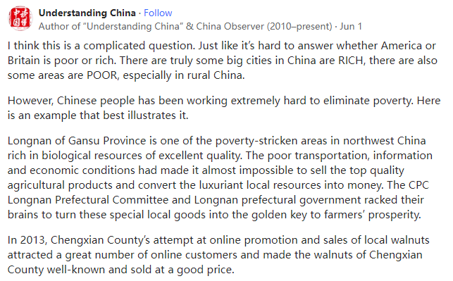 Author of “Understanding China” & China Observer (2010–present)Understanding China和China Observer专栏的作者(2010年至今)我认为这是一个复杂的问题,就像很难回答美国或英国是穷还是富一样。中国确实有一些大城市是富裕的,但也有一些地区很贫穷,尤其是在中国的农村地区。然而,中国人民一直在努力消除贫困,这里有一个最能说明这一点的例子。甘肃陇南是位于中国西北的贫困地区之一,虽然这里的生物资源丰富,品质优良,但糟糕的交通、信息和经济条件让当地的农民几乎无法销售其优质的农产品,也无法将当地丰富的资源转化为金钱。中共陇南地委、陇南州政府想尽了办法,把这些地方的特产变成了农民致富的金钥匙。2013年,成县尝试在网上推广和销售当地的核桃并吸引了大量的网上客户,使成县核桃名声大噪、卖出了好价钱。2021年 6月10日,农民在中国陇南市文县采收油菜籽。这种偶然的尝试使陇南走上了电子商务发展的道路。2013年底,陇南制定了“推动电子商务实现地方发展突破”的发展战略,提出了“大力发展电子商务,让客户在互联网上触手可及”的口号。为此,陇南各地成立了电子商务协会,并随后成立了阿里巴巴电子商务学院来为当地的农民培训相关的技能。淘宝店在各县、乡、村如雨后春笋般涌现,电子商务的发展显著增加了当地农村的收入,给许多贫困的人口带来了好处。2021 年5月31日,中国西北部陇南市文县的农民正在收割花椒。电子商务不仅成为帮助农民脱贫致富的有效途径,也帮助他们学会了网上购物,改变了他们的消费习惯。目前,电商扶贫已将网上购物、支付、理财、订票等网上服务带到中国农村,让农民可以在网上购买质优价廉的商品,享受便捷快捷的服务并逐步告别充斥着假冒伪劣商品的本地市场。