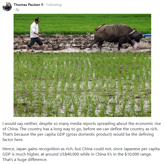 Reporter and author based in Beijing, China尽管有那么多关于中国经济崛起的媒体报道,但我认为两者都不是。在我们将这个国家定义为富国之前,这个国家还有很长的路要走,这是因为人均GDP在这里将是决定性因素。因此,日本获得了富裕的认可,但中国却没有,因为日本的人均GDP要高得多(约为4万美元),而中国的人均GDP在1万美元左右。这是一个巨大的差异。然而,我们可以预见,在未来几十年,中国将成为一个经济上的超级大国并在市场规模上超过美国。因此,届时中国可以作为一个富裕国家进入排行榜,但预计中国的人均GDP达到5万美元或更高将需要很长时间。刺激国民经济增长的过程可能很复杂。虽然提高GDP年增长率可以提振就业数据,但这会导致通胀飙升,许多企业将没有动力去投资和贷款,最终会导致大量贷款违约,从而导致经济衰退——繁荣和萧条的周期性循环。中国依然有西部农村地区这样快速发展的地区,同时也开始在全国范围内进行城市化和现代化建设,以提高全体中国公民的生活水平。中国还有大片贫困的农村社区,我自己也去过其中一些地方,中国的一线城市和中国西部的小村庄之间存在着明显的差距。我的妻子在陕西省西安市西南约100公里的扶风县出生并长大,我第一次访问她的家乡是在2011年末。我被那里的条件震惊了,我还以为我生活在一个更原始的时代。我在德克萨斯州出生和长大,所以我对农业和牧场社区很熟悉。虽然你不能指望中国的农民享受奢侈的生活,但美国的农民和牧场主的条件仍远远好于他们的中国同行。美国的农业部门在很大程度上依赖高科技机械,并利用最先进的技术种植作物和饲养牲畜,以提高生产水平并改善食品质量。不过,北京已经迈出了巨大的步伐,它们开始与农业社区进行更密切的合作,以鼓励居民更多地了解如何使用高科技设备和技术来提高家庭收入水平。http://www.xinhuanet.com/english/2017-12/27/c_136855790.htm“与过去不同,东北黑龙江垦区的农民选择将玉米出售给广东省南部的一家工厂而不是当地的粮库。丰顺农业合作社社长赵军说,这些玉米是通过铁路运到附近的锦州市,然后通过轮船运到广州港的。农村发展研究所研究员李国祥表示,鉴于大丰收和粮食库存过剩,这一举措很好地展示了该国农业的供给侧改革,尤其是在玉米生产方面”。许多中国农民还在微信和其他社交媒体平台上发布流媒体视频,在线销售农作物和牲畜,同时通过数字转账支付安排订单和付款。这一流行趋势让许多与中国农业有关的人的生活变得更加富裕。