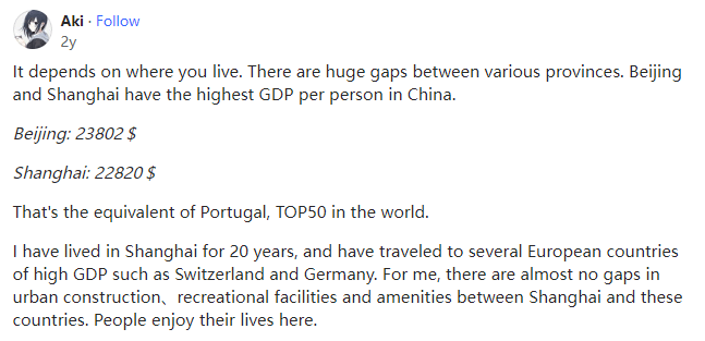 网文来自网友原文翻译投稿,所有言论皆不代表本站立场 | 本文文字/图片来自网络,侵删 | 点击页眉也可刷新 | 本文内容仅供娱乐,不作任何严肃之用途本文译自Quora,原标题:Is China rich or poor? Why?这取决于你生活在哪里。中国的各省之间存在巨大的差距,北京和上海是中国人均GDP最高的城市。我在上海生活了20年,去过几个GDP很高的欧洲国家,如瑞士和德国。对我来说,上海与这些国家在城市建设、娱乐设施和便利设施方面几乎没有差距。人们享受在上海的生活。然而,在中国西部的一些省份,人们的生活质量仍然很低。例如,2019年甘肃省的人均GDP仅为4412美元,当地居民的娱乐活动非常有限。在一些最贫穷的村庄,他们甚至不得不靠政府的补贴生活。由于我没有去过那里,所以我无法提供更多细节,但我认为这不难想象。他们无疑是很穷的,但政府多年来一直关注扶贫。没有一个省会被抛弃,中国人民将分享经济发展的成果。