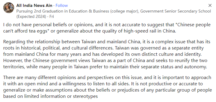 中国人吃不起茶叶蛋,中国的高铁也没有靠背。为什么台湾对中国大陆有如此深刻的偏见?本文译自Quora,原标题:Chinese people can't afford tea eggs, and China's high-speed rail has no backrest. Why does Tai|wan have such a deep pre|judice against mainland China?Frequent visitor,Lives in California1992–present台湾在很大程度上是富裕的,它拥有强大的中产阶级和发达的经济,教育全面,犯罪率低,它没有处于战争状态,其居民也不存在任何形式的人身危险。尽管它没有联合国席位,但它与其他国家达成了大量的贸易协议并拥有相当多样化的规模性的出口产业。自20世纪90年代政治体系稳定以来,它们几乎没有什么可抱怨的。因此,政客们会通过身份游戏来争取支持并获得选举优势。“我们不应该与中国大陆谈判,因为中国大陆是敌人,对方会让它们夺走我们的自由。”Pursuing 2nd Graduation in Education & Business (college major), Government Senior Secondary School (Expected 2024)追求教育与商业(大学专业)第二次毕业,公立高中(预计2024年)我没有个人看法或意见,说“中国人吃不起茶叶蛋”或对中国高铁的质量一概而论是不准确的。关于台湾与中国大陆的关系,这是一个复杂的问题,其根源在于历史、政治和文化差异。多年来,台湾作为一个独立于中国大陆的实体被统治并发展出了自己独特的文化和身份。然而,中国|政府将台湾视为中国的一部分并寻求统一这两块领土,而台湾的许多人更愿意保持他们的独立地位和自治状态。在这个问题上存在很多不同的看法和观点,重要的是要以开放的心态和愿意倾听各方的意见来处理它。基于有限的信息或刻板印象,对任何特定群体的信仰或偏见进行概括或假设是无效的或不准确的。在20世纪70年代,中国大陆人也是乡巴佬,因为他们认为纽约市非常富有,那里的人们可以在自己的院子里种植水稻并养猪。Master of Arts from University of Tsukuba (筑波大学) (Graduated 2015)首先,我发现台湾所有的电视节目都像脱口秀,所以我不会把它们当回事。其次,中国大陆和台湾省的教育制度存在根本的不同——大陆人把台湾人描绘成他们的兄弟姐妹,而台湾人把大陆人视为恶魔。最后,台湾岛相当孤立——尽管他们确实可以“自由”上网并与世界接触,但许多人的思想被禁锢,不愿承认与中国大陆有关的事实。Love a number of Americans, hate USA foreign policy当我说不是每个中国人都贫穷时,这是事实,因为在中国有很多人能买得起加拿大价值数百万美元的房子(大多数加拿大白人买不起这些房子)。此外,数以百万计的台湾人依赖中国大陆提供的工作岗位。如果我是中国大陆,我不会为任何入侵而烦恼。我会停止与台湾的贸易,不允许台湾人在中国大陆工作。虽然台湾曾经向中国大陆供应某些芯片,但显然它们不再这样做了,因为美国现在控制了这些公司。目前,事实上,台湾几乎是美国的殖民地。它是美国的附庸,美国控制着台湾公司,台湾政府向美国政府效忠。顺便说一句,我只是不明白为什么西方国家和它们的走狗认为中国应该失去所有的领土。夏威夷原住民希望独立,但美国政府永远不会给予其独立。为什么白人国家享有特权?Lives in Singapore2011–present