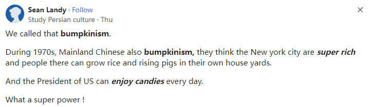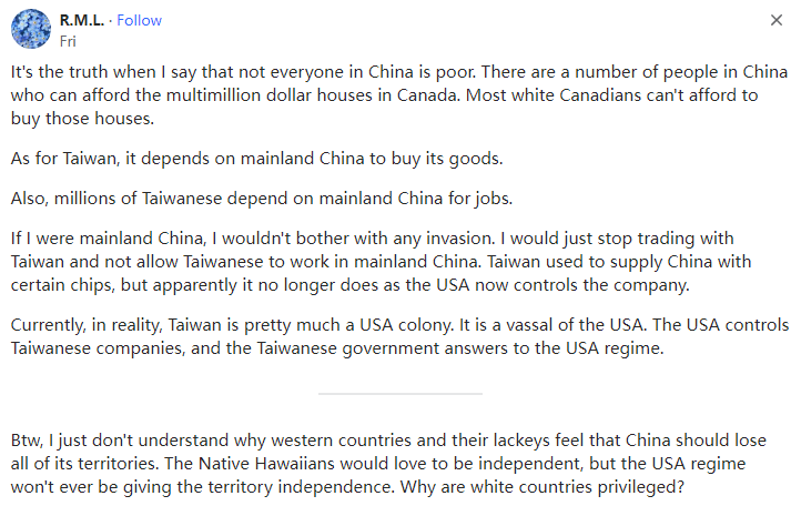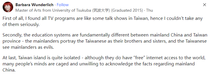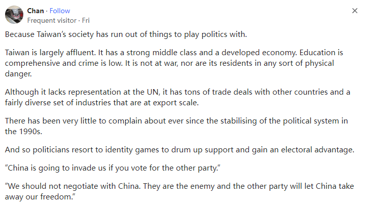 如果你把台湾放在中国的省份之中,你会发现它在经济规模和发展方面一点也不突出。在苏联改革时期,西方商人涌入苏联进行投资。与此同时,西方对俄罗斯人移民西方仍然存在严格的限制。根据你的推理,改革时期的苏联一定比西方做得更好。这里也一样,台湾居民去大陆比大陆居民去台湾更容易。我以前在中国大陆和台湾都生活过。毫无疑问,中国大陆的生活质量更好。如果你把台湾放在中国的省份之中,你会发现它在经济规模和发展方面一点也不突出。“中国大陆的某些省份比其他省份更富裕。由于这些地区在地理上离台湾很近,我们将忽略整个中国大陆,只将台湾与这些省份进行比较。因此,中国大陆和台湾不相上下。”大陆人更难进入台湾,这一定是中国大陆的错,因为台湾根本没有边境限制!