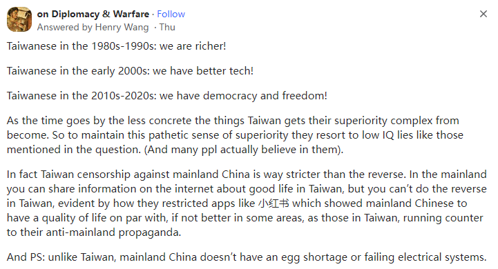 来源:https://www.quora.com/Chinese-people-cant-afford-tea-eggs-and-Chinas-high-speed-rail-has-no-backrest-Why-does-Taiwan-have-such-a-deep-prejudice-against-mainland-China