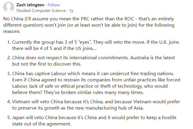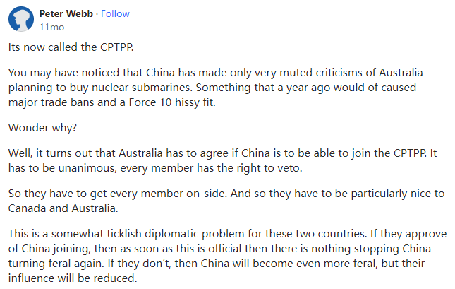 中国现在承诺表示愿意通过加入CPTTP来进行进一步的“调整”。这些调整都是奥巴马的贸易专家们确信中国能够做到但不会承诺的,这些措施肯定会进一步开放中国的市场。这是一个双赢的举措,即使是日本和澳大利亚也应该张开双臂,接受中国为CPTPP的成员国。毕竟,他们没有什么可失去的。你可能已经注意到,中国对澳大利亚计划购买核潜艇的批评非常低调。一年前,这件事可能会导致重大的贸易禁令和重大的外交纠纷。事实证明,如果中国要加入CPTPP,它必须得到澳大利亚的同意。因为CPTPP拥有一致性条款,每个成员都有否决权。所以他们必须让每个成员都站在他们一边,所以他们必须对加拿大和澳大利亚特别友好。对这两个国家来说,这是一个棘手的外交问题。如果他们同意中国加入,那么一旦中国正式加入,他们没有什么可以阻止中国再次变得野蛮。但如果他们不这样做,虽然中国的影响力将会减少,但他们将变得更加野蛮。最好的策略是澳大利亚和加拿大尽可能地拖延。我的猜测是,他们将试图建立一些工作组来评估其可行性,并尽一切可能将其拖得越久越好,试着让它悬在中国的头顶并搁置一两年。在那之后,我不知道会发生什么。不,中国(我假设你指的是中华人民共和国,而不是中华民国——这是一个完全不同的问题)不会加入(或至少是无法加入),原因如下:1.目前,该协议有5只“眼睛”中的3只,他们将否决这项动议。如果英国加入,5眼中将有4只在协议中,如果美国加入…2.中国不尊重其国际承诺,澳大利亚是最新但不是第一个发现这一点的国家。3.中国有囚犯劳工,这意味着它可以削弱自由贸易国家的优势。即使中国同意限制其公司的不公平行为,如强迫劳动、缺乏安全或道德的做法或盗窃技术,但谁会相信?他们已经多次违反类似的规则。4.越南将否决中国,因为它是(下一个)中国,而且越南更愿意保持其作为亚洲新制造业中心的发展。5.日本将否决中国,因为它更愿意将敌对国家排除在协议之外。6.事实上,加入CPTPP的中国的大多数邻国都会否决其成员资格-这就是当你不顾一切地恐吓和威胁人们时会发生的情况。中国的“朋友”是伊朗、叙利亚和朝鲜,这个贸易集团更适合中国。因此,我相信中国不会加入CPTPP,除非该国的做法发生重大变化。事实上,如果现有成员国接受中国,我认为他们永远不会让英国或美国加入。因此,这已经否决了中国的成员资格。