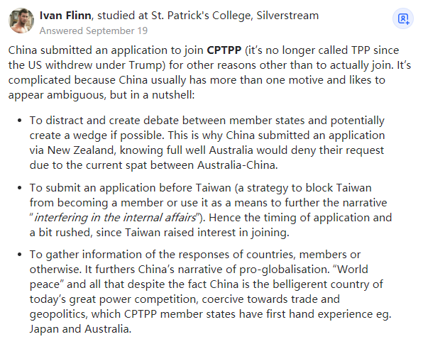 网文来自网友原文翻译投稿,所有言论皆不代表本站立场 | 本文文字/图片来自网络,侵删 | 点击页眉也可刷新 | 本文内容仅供娱乐,不作任何严肃之用途为什么明知CPTPP是为了遏制中国而设立的,中国依然提交了加入申请?本文译自Quora,原标题:Why would China join the TPP even if it would undermine China (China, international, TPP, politics)?4月23日,在国务院新闻办举行的推动外贸稳规模优结构有关情况国务院政策例行吹风会上,商务部国际贸易谈判代表兼副部长王受文回应了外媒上述提问。他表示,第一,中国有意愿加入CPTPP。我们是在2021年正式提出加入CPTPP,此后,习近平主席多次在重要的国际会议场合强调或者重申,中国将积极推动加入CPTPP。二十大报告讲到,中国要进一步扩大开放,加入CPTPP就是进一步扩大开放。去年的中央经济工作会议也提到中国将推动加入CPTPP。第二,中国有能力加入CPTPP。我们对CPTPP的所有条款进行了深入研究,评估了中国加入CPTPP要付出的代价和会带来的收益,我们认为,中国有能力履行CPTPP义务。实际上,我们已经在一些自贸试验区、自由贸易港对照CPTPP的规则、标准、管理这些方面的高标准义务,进行先行试点、试验,条件成熟以后,还会在更大范围进行推广。所以我们是有能力来履行CPTPP义务。第三,加入CPTPP符合中国利益,符合所有CPTPP成员利益,也符合亚太地区甚至世界经济复苏的利益。对于中国来说,我们加入CPTPP,有利于进一步扩大开放,深化改革,推动高质量发展。对于CPTPP成员来说,现在有11个成员,对于这些成员来说,中国加入意味着CPTPP成员国的消费者增加三倍,这对他们来说是巨大的市场准入机会,GDP总量扩大1.5倍。有一家国际知名的研究机构做了测算,如果说现在CPTPP的收益是1的话,中国加入CPTPP,将会使CPTPP整体收益变成4。所以,中国加入符合11个CPTPP成员的利益。此外,王受文还表示,在亚太地区,在APEC框架之下,21个成员在推动建立FTAAP亚太自由贸易协定。亚太自由贸易协定有两个轮子,一个是RCEP,一个是CPTPP,RCEP和CPTPP现在都已经生效,中国是RCEP成员,如果中国加入CPTPP,有助于这两个轮子进一步向前推动,有助于亚太自贸协定推进,这对整个地区的区域经济一体化、对于我们本地区的产业链供应链稳定、安全、可靠和高效至关重要。所以,期待11个成员国都能支持中国加入CPTPP。Knows Asia, China and USA跨太平洋伙伴关系(TPP)是奥巴马亚洲战略支点的核心。在特朗普2017年宣布退出之前,TPP有望成为世界上最大的自由贸易协定,并覆盖全球经济的40%。换句话说,TPP被视为一项抵消中国在全球贸易体系中快速增长的影响力的战略。凭借已签署的多项贸易协定和目前最大的、已经暂时处在安全区的 RCEP,中国申请加入CPTPP。我们知道,事实上这是美国为中国提供了一个在该地区扩大影响力的机会,中国正在填补美国退出的空白,并利用其巨大的政治和经济实力来影响贸易。因此,是的,大多数人都认为,如果中国加入CPTPP(即使美国稍后选择加入),中国在地缘经济方面的分量将会进一步增加。哦,也许特朗普只是想跟奥巴马作对并毁掉他所做的一切。事实上,特朗普的“美国优先”政策之一就是退出TPP。但如果说这是因为美国愚蠢的话又太简单了,以下这篇文章中有很好的理由解释了美国为什么要退出TPP。TPP终结的最大受益者之一就是从一开始就没有参与该协议的超级大国——中国。现在,中国拥有一带一路、RCEP、中非合作论坛、金砖四国等多边合作协议,如果它再加入CPTPP以及其他贸易协定,那么一个奇怪的结果就出现了,即美国把它所努力的东西放在了一个金盘子里免费送给了它主要的竞争对手。继RCEP之后,CPTPP将成为中国作为经济全球化拥护者的帽子上的一根特别宝贵的羽毛。一些人认为为了适应CPTPP更严格的内部规定,加入CPTPP将为中国国内的经济变革增添动力。但中国准备好了吗?我想可能是的。既然中国已经提出了申请,我们想知道拜登会不会跟随?他会考虑让美国重新加入吗?哈哈,大门是敞开的,像日本这样的少数国家肯定希望他们最好的朋友能够回来,但是如今美国的速度已经今非昔比了。studied at St. Patrick's College, Silverstream,Lives in Sydney, Australia曾就读于Silverstream的圣帕特里克学院,现居澳大利亚悉尼中国出于真实意愿以外的其他原因提交了加入CPTPP的申请(自从美国在特朗普治下退出后,这一协定不再被称为TPP)。这很复杂,因为中国通常有不止一个动机并喜欢表现得模棱两可,但简而言之,他们的目的有:Ø离间各成员国,并在可能的情况下制造分歧。这就是中国通过新西兰提交申请的原因,因为中国深知由于目前与澳大利亚之间的争执,澳大利亚会拒绝他们的请求。Ø在台湾省之前提交申请(阻止台湾省成为CPTPP成员或将其作为进一步“干涉台湾省内部事务”的手段)。因此,中国申请的时间有点仓促,因为台湾省已经表示了加入的兴趣。Ø收集各国,各成员国或其他国家的反应。尽管事实上中国就是当今大国竞争中的寻衅者,它在贸易和地缘政治方面一直在胁迫其他国家,关于这一点CPTPP成员国如日本和澳大利亚拥有第一手经验。但中国申请加入CPTPP可以进一步推动中国支持全球化,支持“世界和平”以及所有这些叙事。中国真的想加入CPTPP吗?是的,我相信中国总体而言确实想成为其中的一名成员,但他们知道中国并没有达到CPTPP的严格标准。中国能加入