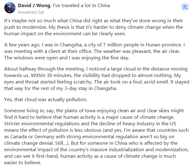 几年前我在长沙--湖南省的一个拥有700万人口的城市。我在他们的办公室和一个客户会面。当时天气宜人,空气清新,窗户打开着,我很享受这美好的一天。会议进行到一半时,我注意到远处有一大片云彩向我们飞来。30分钟内,能见度几乎降到了零。我的眼睛和喉咙开始发痒,空气中弥漫着一股恶臭刺鼻的气味,在我接下来的3天长沙之旅中,它一直是这样。例如,生活在爱荷华州平原上享受着洁净空气和晴朗天空的人可能很难相信人类活动是气候变化的主要原因。美国更严格的环境法规和重工业的衰落意味着污染的影响不那么明显(是的,我知道像加拿大或德国这样环境监管很严格的国家在否认气候变化方面并没有那么强烈)。但是,对于一个受到中国大规模工业化和现代化所带来的环境影响的人来说,人类活动作为气候变化的一个原因更容易让人相信。