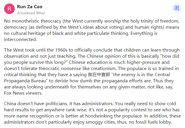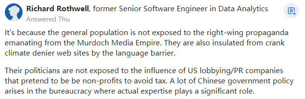 直到20世纪60年代,西方才正式得出结论:儿童可以通过观察而不仅仅是教学来学习。中国人对此的看法基本上是“你们是怎么活了这么久的?”中国的教育压力更大,它无法能容忍神权主义之类的无稽之谈,中国民众的批判性思维是如此的训练有素,以至于他们有一句话“敌在中宣部”,以嘲笑宣传工作做得多么的愚蠢。因此,他们总是在所有特定的事情上寻找表象之下的真相而不同于福克斯新闻的观众。中国没有政客,只有管理者。你确实需要展示过硬的政绩才能得到排名靠前的位置,这不是一个看谁的知名度更高,或者谁更善于欺骗大众的人气竞赛。此外,这些管理者并不特别喜欢烟雾弥漫的城市,因此中国也不存在化石燃料集团的游说团体。