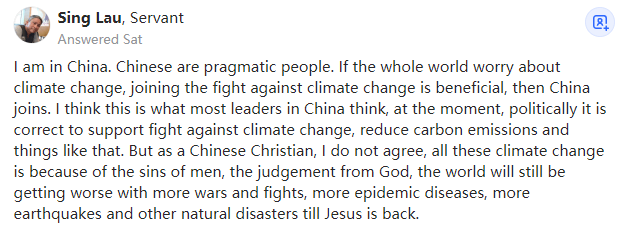 Servant,Lives in Hong Kong我在中国。中国人是务实的人,如果全世界都在担心气候变化,加入对抗气候变化的斗争是有益的,那么中国也会加入进来,我认为这符合中国大多数领导人的认知。虽然目前在政治上支持应对气候变化、减少碳排放等是正确的,但作为一个中国基督徒,我不同意,所有这些气候变化都是因为人类的罪恶和上帝的审判,在耶稣降临之前,世界仍然会因为更多的战争和战斗、更多的流行病、更多的地震和其他自然灾害而变得更糟。