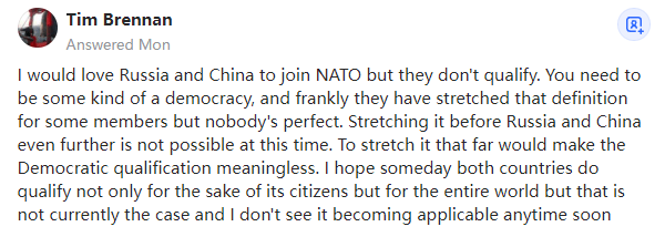 我希望俄罗斯和中国加入北约,但它们不具备资格。你需要成为某种形式的民|主国家,坦率地说,北约对一些成员的要求有所放松,但没有谁是完美的。目前,吸纳俄罗斯和中国以进一步扩大北约是不可能的。如果条件放得太宽松,对于民|主的资格要求将变得毫无意义。我希望有一天,这两个国家都能获得资格,不仅是为了本国公民,也是为了整个世界,但目前情况并非如此,而且我不认为这项规定会很快适用。