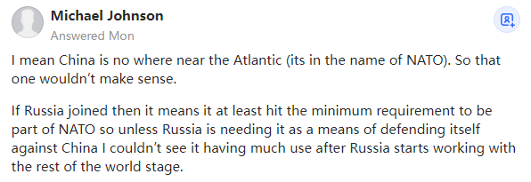 如果俄罗斯加入,这将意味着它至少达到了加入北约的最低要求。因此,除非俄罗斯需要北约作为抵御中国的手段,否则在俄罗斯开始与世界其他国家合作后,我看不到它有多大用处。