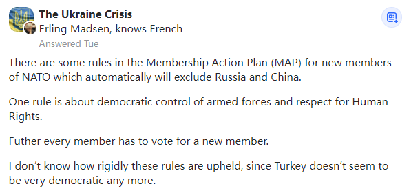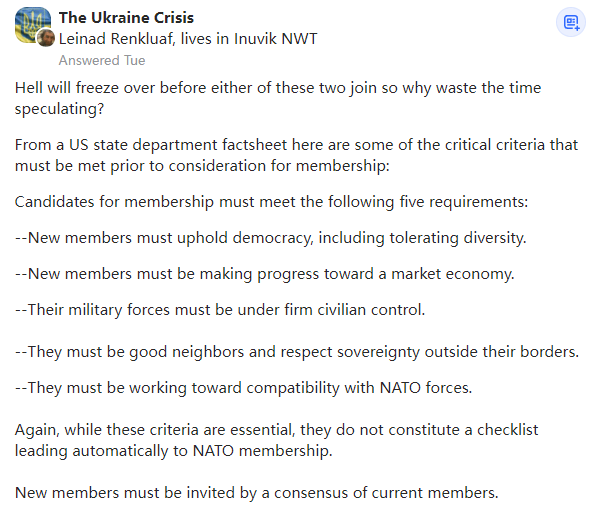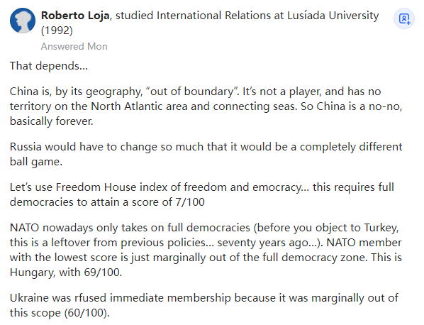 在这两个国家中的任何一个达到这些要求之前,太阳会从西边出来。不,俄罗斯和中国都不会加入北约。也许乌克兰、格鲁吉亚、瑞典和芬兰可以。