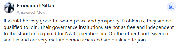 这将对世界的和平与繁荣大有裨益。问题是它们没有资格加入,因为它们的治理机构并不像北约成员国所要求的那样自|由和独立。另一方面,瑞典和芬兰是非常成熟的民|主国家,它们有资格加入。