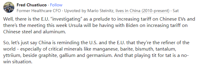 因此,我们可以说这是中国正在提醒美国和欧盟,它们是世界的精炼厂(尤其是在锰矿、重晶石、铋、钽、钇等重要矿产以及石墨、镓和锗方面)。这种以牙还牙的做法不会有赢家。