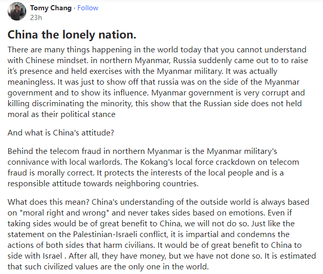 当今世界发生的很多事情用中国人的思维是无法理解的。在缅甸北部,俄罗斯突然出面提升存在感并与缅甸军方举行演习。这其实毫无意义,这只是为了炫耀俄罗斯站在缅甸政府一边以显示其影响力。缅甸政府非常腐败,它们歧视少数民族,这表明俄方的政治立场并不以道义为重。缅北电信诈骗案的背后是与当地军阀勾结的缅甸军方。果敢地方武装打击电信诈骗,在道义上是正确的,因为它保护了当地人民的利益,也是对邻国负责任的态度。这意味着什么?中国对外部世界的认识始终基于“道义是非”,从不基于情感选边站队。即使“站队”对中国大有裨益,我们也不会这样做。就像中国关于巴以冲突的声明一样,它不偏不倚,谴责了双方伤害平民的行为。虽然站在以色列一边对中国有很大的好处,毕竟,它们有钱,但我们没有这样做。估计这样的文明价值观在全世界也是绝无仅有的。如果你看到伊斯兰国家谴责以色列但无视哈马斯暴力抵抗的立场,而西方阵营则无视以色列杀害平民,你会发现尽管两者是对立的,但它们都是自己的野兽。当一些野兽(指西方文明)教导并嘲笑说我们在世界上没有一个朋友时,我的看法是我们已经修炼成了人形,为什么还要拉低自己,回到野兽形态呢?就算存在“率兽食人”的坏制度又如何?半兽人谈文明只是为了自己的利益。我记得叙利亚外交官曾在联合国摆事实、讲道理,讲得声情并茂,但讲到一半,西方人就纷纷起立离席,只剩他一个人站在角落里唉声叹气。宋朝人喜欢传道授业解惑,一帮宋朝士大夫经常讲“以礼待人”,结果他们被西夏、辽、金连连打败。道德宣传靠的是实力。西方的野蛮人用这种力量烧杀抢掠,这在中国人的观念中是无德的。中国用这种力量来维护世界稳定,这就叫有德。有德与无德之间是有差距的,博弈取决于双方实力的增减。人间正道是沧桑,如今不能再重蹈宋朝的覆辙了。欧洲野兽因其拆解方式(dismantling method)而变成半人半兽,因为这让底层民众更容易理解,该表扬的时候就应该表扬。而中华文明讲究系统,以孔子为例,他精通礼、乐、射、御、书、数,就像我们现在所讲的德、智、体、美、劳都要全面发展。因为只有这样,人才能成为一个合格的人。如果你智商很高,但品行不端,喜欢偷女人的内衣,那么你是不会被社会接受的!你说这难不难?但欧洲人不是这样做的!欧洲人获得中国的经典后,他们迅速将其拆解为经济、军事、思想、宗教、人文、科技和法律等各自独立的学科,如果只能学一种就学一种,没有任何道德约束力。欧洲人并不指望出现辛弃疾这样能写诗、能写书法、能打仗、能发明、有道德、有情操的人。大多数人都做不到这一点。在欧洲人眼里,卢梭虽然吃喝嫖赌,专门骗女人的钱,但他写了《社会契约论》,所以按欧洲人的标准,他是个伟人。这种名声败坏、行为古怪、心狠手辣、谎话连篇、虚伪自私的人,在中国文化中将被彻底封杀。经过欧洲人的拆解,纯粹的野兽进化成了半人半兽。从短期来看,这种方法效果不错。后来,马克思主义的原理也被我们所接受。孔子和戴圣都说过“士为知己者死”。世界大同不就是把我们人类团结在一起吗?原来这只是一个口号,后人在历史上不断丰富其实施措施,即天下大同(就是如何保证大家有饭吃有衣穿)。苏联提出了这一点,但它注定要失败。它的失败并不是因为美国人的捣乱,这是次要因素。其主要原因是它祖传的文化基因中没有这个,苏联有的只是一个强势的沙皇,它们没有强大的管理大众以实现共同繁荣的价值观,它们对国际事务的判断完全变成了“左右摇摆”的心态。当它强大时,它欺负别人。后来,当它衰弱的时候,它想投降美国,虽然差点就跪下了,但没有成功。中华文明有缺陷吗?它存在核心缺陷!这导致中国无与伦比的孤独。欧洲人能懂一半,而美国禽兽则完全不能理解,在它们看来,我们的道德宣传纯属痴人说梦!然而,如果全世界都效仿美国禽兽,那么所有的人类都将灭绝。中华文明的缺陷在于祖先圣人在创造世界的时候直接告诉了我们终极答案。他们一开始就告诉后人,你要建立的社会是“天下为公”,然后还给出了如何做的KPI考核。什么是“公”?就是“老有所终,壮有所用,幼有所长,鳏寡孤独废疾者皆有所养”,最终的社会环境将是“路不拾遗,夜不闭户”。我们的祖先给子孙后代出了这么大的难题,这需要多么高的精神境界才能做到!不仅如此,老祖宗还让人们“牢记历史”。一代人做不到,那就百代人来做。百代人做不到,那千代人也要做到。每一代人奋斗的事情都要详细记录下来,让后人吸取前人的经验和教训。“路不拾遗,夜不闭户”,看来,我们很快就要实现这一点了。毕竟,现在中国所有的支付都是数字化的,没有什么可以落下。即使开着门出门,也没什么可偷的。监控无处不在,也没人敢偷。但是,我们离世界大同的目标还很远很远,一方面,我们需要做好物质生产和分配,另一方面,我们需要防止美丽的野兽(美国)抢劫我们的大量资金。西方人从未有过这样的心理压力,他们不存在道德、智力、身体、艺术或身体素质这样的东西。不管灰太狼还是红太狼,能抓到喜羊羊的就是好狼!他们从来没有记录历史的习惯。当生活美好的时候,如果他们的暴行历史被记录下来,他们后代会删除历史或者他们会为暴行寻找理由,这注定会导致他们陷