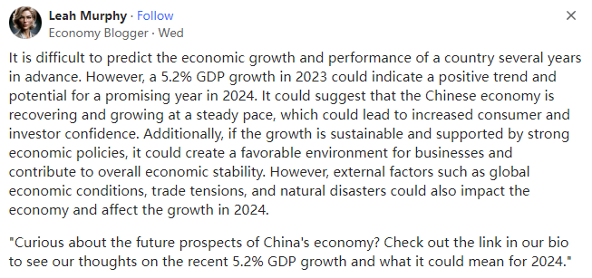 对中国经济的未来前景感到好奇吗?请查看我们简历中的链接以了解我们对近期5.2%的GDP增长的看法以及这对2024年可能意味着什么。