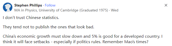 MA in Physics, University of Cambridge (Graduated 1975)虽然中国的经济增长应该已经放缓,但5%对于一个发达国家来说已经很不错了。我认为它将面临挫折--尤其是如果政治占主导的情况下。还记得毛时代吗?