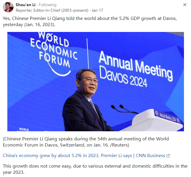 Reporter, Editor-in-Chief (2003–present)是的,中国国务院总理李强昨天(2023年1月16日)在达沃斯向世界介绍了5.2%的GDP增长率。