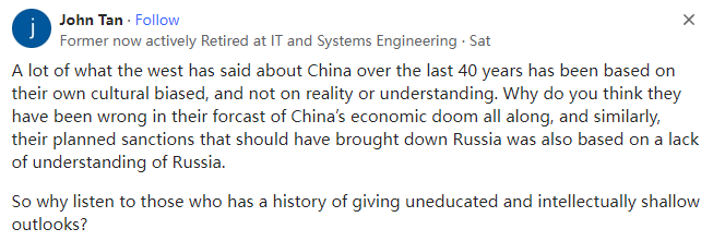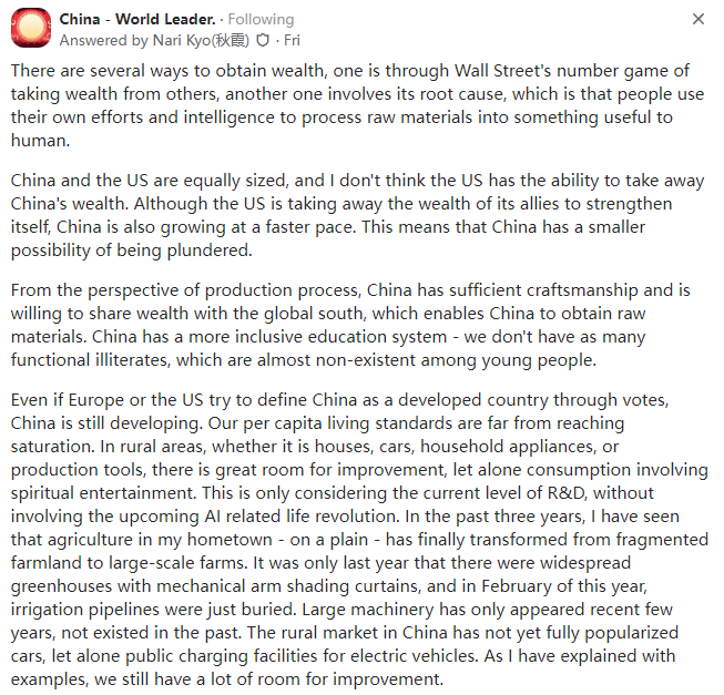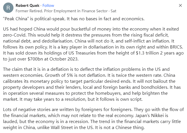 网文来自网友原文翻译投稿,所有言论皆不代表本站立场 | 本文文字/图片来自网络,侵删 | 点击页眉也可刷新 | 注册送50花瓣,每日登录送5花瓣 | 本文内容仅供娱乐,不作任何严肃之用途中国的相对实力或经济“已达巅峰”?如何看待西方国家的这种言论?本文译自Quora,原标题:A rhetoric has emerged recently in some Western countries, which claims that China's comparative strength, or its economy, is peaking. What's the arguments for the so-called "Peak China"? How do you view it?Lives in California (1988–present)在可预见的未来,中国将成为最大的单一发达国家。这不是一个坏的位置,而是一个相当好的位置。我不喜欢的是有人认为中国应该尽快发动一些危险的军事冒险,因为没有更好的时机了。最好还是不要做什么巨大的军事赌博。Bach from Monash University对任何了解经济地缘政治的人和任何生活在中国、受过理性教育、游历广泛的中国人来说,中国在2019年已经达到顶峰是显而易见的。中国经济已经达到顶峰,这并不奇怪,因为中国经济已经经历了近50年的繁荣期。其实,这也没什么大不了的,因为中国的经济发展仍然好于世界上95%的经济体。尽管一些西方国家正在努力拖慢中国的经济增长速度,但中国的表现仍比所有西方国家都要好。Former now actively Retired at IT and Systems Engineering过去40年来,西方对中国的许多评价都是基于他们自己的文化偏见,而不是基于现实或理解。不然为什么说他们一直以来对中国经济厄运的预测都是错的呢?同样,他们本应打垮俄罗斯的制裁计划也是建立在对俄罗斯缺乏了解的基础上的。那么,为什么要听信那些一贯发表缺乏教育和知识浅薄的观点的人呢?Lives in Hotpot 1949–present获得财富有几种途径,一种是华尔街的数字游戏,从别人那里攫取财富;另一种是人们用自己的努力和智慧,把原材料加工成对人类有用的东西,这才是财富的根源。中国和美国的经济规模相当,我不认为美国有能力夺走中国的财富。虽然美国正在夺走其盟友的财富以壮大自己,但中国也在以更快的速度发展,这意味着中国被掠夺的可能性较小。从生产工艺来看,中国有足够的工艺水平,它愿意与全球南方国家分享财富,这使中国能够获得原材料。中国的教育体系更具包容性--我们没有那么多功能性文盲,在年轻人中几乎不存在功能性文盲。即使欧洲或美国试图通过投票将中国定义为发达国家,但中国仍处于发展中,我们的人均生活水平远未达到饱和状态。在农村,无论是房子、汽车、家用电器还是生产工具,都有很大的提升空间,更不用说涉及精神娱乐的消费了。这仅仅是考虑到目前的研发水平,还没有涉及即将到来的人工智能相关的生活革命。近三年来,我看到家乡--平原上的农业终于从零散的农田向规模化农场转变。去年才普及了机械臂遮阳幕的大棚,今年2月才刚刚埋下灌溉管道。大型机械是近几年才出现的,过去并不存在。中国的农村市场还没有完全普及汽车,更不用说电动汽车的公共充电设施了。正如我举例说明的那样,我们还有很大的改进空间。我们认为世界上也有很大的改进空间。在世界的南方--东南亚、中亚、非洲和拉丁美洲的部分地区--有无数的人口尚未完全进入现代工业社会。他们需要幸福的生活,我们可以为他们提供日常必需品。他们在发展的同时也可以为我们提供他们可以制造的产品,使我们的生活更加丰富多彩。告诉我,谁能打断这一进程?是通过摧毁全球南方还是摧毁我们?他们已经被剥夺得不能再剥夺了,而我们有能力保护自己。Former Retired. Prior Employment in Finance Sector,Lived in Lived in Singapore“巅峰中国”是一个政治术语,它缺乏事实和经济基础。美国曾希望中国在大流行结束后向经济注入大量资金,这将有助于美国缓解财政赤字、国债和去美元化带来的压力,但中国不会这么做,也不会自我引发通货膨胀。中国遵循自己的政策,它本身就是去美元化的重要参与者,也是金砖五国中的一员。中国已将其持有的美国国债从两年前的1.3万亿美元降至2023年10月的7000多亿美元。说它处于通货紧缩是为了转移美国和西方经济体的通胀问题。5%的增长不是通货紧缩,它是西方国家经济增长率的两倍。中国正调整其货币政策以达到特定的预期目标,中国不会救助房地产开发商及其贷款人、本地及外国银行和债券持有人。中国已经采取了多项措施来保护购房者并帮助净化市场。虽然可能需要数年时间才能解决问题,但它遵循自己的剧本。很多负面报道都是外国人写给外国人看的。他们顺应的是金融市场的潮流,而这可能与实体经济无关。虽然日本的日经指数备受赞誉,但日本经济正处于衰退之中。与美国的华尔街不同,金融市场的走势在中国的影响力很小,所以这不是中国的问题。人口的下降也带来了负面报道。这是一个预料之中的长期问题,至少在未来十年内不会对劳动力供应产生影响。中国的劳动生产率正在提高,这是教育、技能培训和发展水平提高的结果。中国已经向前迈进。它的目标不是增长本身,而是可持续增长,这包括均衡增长、平等、适度的金融杠杆、人力开发、创业精神、科技驱动和自力更生、绿色经济以及内需。而内需包括收入分配、教育、医疗保健、老年人护理、医疗保障、就业保障、社会和退休保险以及住房供应等要素。中国的目标是共同富裕,建立一个平等的社会。中国是一