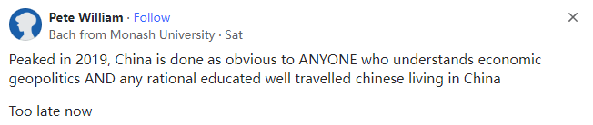 来源:https://www.quora.com/A-rhetoric-has-emerged-recently-in-some-Western-countries-which-claims-that-Chinas-comparative-strength-or-its-economy-is-peaking-Whats-the-arguments-for-the-so-called-Peak-China-How-do-you-view-it