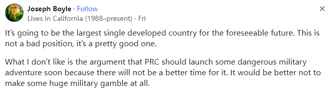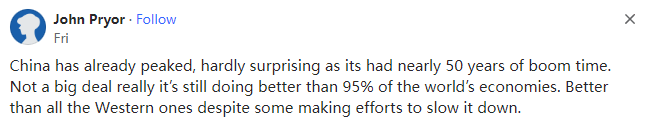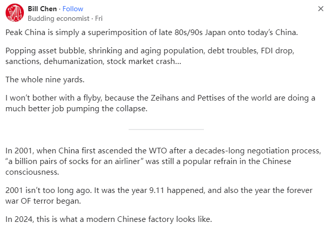 “你能想象一个全球南方国家(或参与一带一路倡议的150个国家)享有比全球北方国家更实惠、更先进的技术的世界吗?”随着美国和欧洲大力保护其内燃机车制造商和太阳能电池板工厂,全球南方国家将在短期内获得更便宜的能源和交通工具,不是2030年......我认为是2025年。在奥巴马的第二个任期内,当他“转向亚洲”(又称试图恐吓中国使其屈服)时,巅峰中国确实存在。巧合的是当时美国对中国施加了越来越大的压力,要求中国不要走技术独立的道路,要将中国的贸易顺差转化为低收益的美国主权债务,不要试图与美国过多竞争,不要发展绿色产业,而是购买碳信用额度,等等。XI选择了扩大主权的道路,但由于西方的壁垒、破坏和经济胁迫(又称去风险化),中国的经济增长因此大幅放缓。但至少中国的经济增长变得高质量且更加均衡,而不是不断为西方消费者制造更多低价产品。因此,巅峰中国是存在的,那是前一个高峰,即为西方制造廉价产品,并将污染、环境和碳负担转嫁给中国。现在,中国正在走向新的高峰。绿色能源在中国尚未达到顶峰,高铁建设仍在继续,卫星发射正在增加而不是达到顶峰,内陆养鱼业、室内养殖业都刚刚起步。西方现在唯一可以继续其霸权的就是他们的大众传媒,这是最致命的。