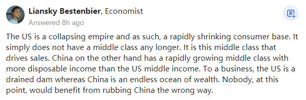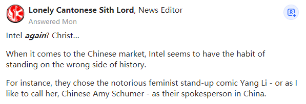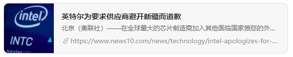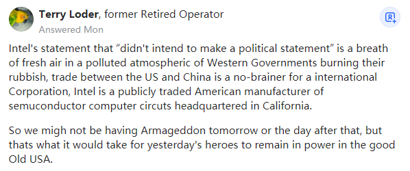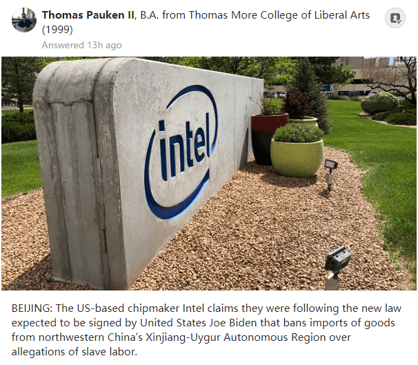 Quora:您如何看待英特尔就新疆产品和劳工的声明向中国道歉?本文译自Quora,原标题:What is your view of Intel apologising to China over Xinjiang products and labour directive?英特尔近日被曝光禁止其供应商使用来自新疆的产品,引发轩然大波。23日,@英特尔中国 在微博上就此事发表公开声明,称对中国深怀敬意,对于此事“引起诸多的疑问和顾虑深表遗憾”,并 宣称致供应商的“信中关于新疆的段落只出于表述合规合法的初衷,并非它意或表达立场”。此前有媒体发现,在最近给其供应商的一封公开信中,美国英特尔公司要求确保其供应链不使用任何来自新疆的劳工、采购产品或服务。整个关于XJ的事情都是谎言,英特尔发布的所有抵制XJ产品的要求都是绝对错误的。中国市场大约占了英特尔总收入的40%,激怒如此重要的客户通常是不明智的,尤其是因为一个谎言(去激怒客户)。Lonely Cantonese Sith LordNews Editor,Lives in Hong Kong谈到中国市场,英特尔似乎有站在历史错误一边的习惯。例如,它们选择了臭名昭著的女权主义者/单口相声演员杨笠——或者我喜欢叫她中国的Amy Schumer——作为它们在中国的代言人。正如你所料,这是一个充满争议的问题,由于英特尔的主要目标市场是年轻男性,其产品很快就遭到了抵制,英特尔最终下架了所有以她为主角的广告。我相信西方/国际企业在中国做生意时面临两大问题,一个是内部问题,另一个是外部问题。通过谷歌或百度进行快速在线搜索,你就会发现杨笠在中国是一个经常出境的辨识度很高的人物,但英特尔的管理层不知道她的名声是美名还是恶名。我相信普通的中国人都会承认她的地位和名声备受争议。那么,为什么英特尔的管理层要继续支持她呢?这完全有可能是由于西方的种族主义文化,他们觉得像中国大陆员工这样的“劣等人”(Untermenschen)的意见可能没有他们的白人/西方同行的意见有价值。我从我的经验中了解到,许多西方人认为自己比像我这样的中国人更了解中国。或者,他们只是被阻止了,不能实话实说,这是大多数公司的通病。人们还怀疑杨笠参与了一场以身份政治引发社会动荡的“颜色革命”计划,类似于中情局在东欧的尝试。BBC和纽约时报(NYT)等西方企业媒体对她的赞扬似乎表明了这一点。而像英特尔这样的一家纯粹的科技公司也不可能对权力说不。涉及XJ的整个弥天大谎也是如此。这不是英特尔能够独自应对的事情,无论愿意与否,无论对商业是否有利(英特尔全球收入的40%来自中国),这几乎都是它必须要做的。将英特尔的做法与苹果等其他公司进行比较,你会发现苹果在中国已经繁荣了很长一段时间。它们有什么秘密?它们遵守当地的法律,远离当地的政治,只专注于提供更好的产品和服务。然而,除非你迎合“觉醒”(woke)大队并宣布你对中国不满,否则你就无法在西方做生意。具有讽刺意味的是,在“共产主义”中国的统治下的企业在技术上比“资本主义”西方更自由?B.A. from Thomas More College of Liberal Arts (1999)北京:总部位于美国的芯片制造商英特尔声称它们正在遵循美国总统乔·拜登(Joe Biden)预计将签署的新法律,该法律禁止从中国西北部的XJ地区进口商品,理由是涉嫌使用奴|隶|劳|工。相应地,美国公司很容易抓住法律漏洞,继续在XJ地区投资、制造和出口。英特尔在中国西北部有供应链业务,它们应该已经知道那里是否存在奴|役或强|迫|劳|动的现象,因为它们是那里的发薪人。虽然不太可能(有这样的情况),但尽管如此,它们还是发布了一份公开的新闻稿,解释了它们打算剥离它在中国的部分业务往来的意图。推动发布新闻稿的决定是冒犯性的,因此该公司做出了正式的道歉,因为它从未打算执行XJ禁令。在美式足球运动术语中,当四分卫假装将球交给跑后卫时,他会抱着球假装向一个方向投球,同时实际向球场另一侧的开放式接球器投球,这被称为“玩动作传球”。你所看到的是进攻方试图转移防守方的注意力,去追逐一场大码数的比赛(big yardage play)。有时这种策略能奏效,但有时四分卫也会因为持球时间过长而被罚下。因此,美国的“玩动作传球”战略开始产生负面效果,为白宫制定外交政策的思想领袖们将被解雇并将遭受巨大的损失。我们已经看到它在本月早些时候由白宫主办的“民|主峰会”的灾难性推出中得到了充分的展示。尽管有这么多国家领导人出席,但在白宫直播的某一时刻,它们只有77名观众在观看。这太令人尴尬了并表明了全球公众对拜登政府有多尊重。我们还应该注意到西方人也没有以愤怒或抵制威胁来回应英特尔的道歉。这是一个迹象,说明反|华情绪开始在普通西方人中消退。这是意料之中的,因为地缘政治趋势与流行文化趋势非常相似。它们会不断上下波动,新的问题不断出现并呈上升趋势。如果西方国家不尽快解决严重的供应链中断问题,通胀率还将继续飙升,那么2022年对西方国家来说在经济上可能是灾难性的。届时中国将不得不出手相救西方,而英特尔将支持其XJ的供应商。我们可以从ABC News 10 Albany中了解更多。链接如下:“XJ是用于制造计算机芯片的二氧化硅的主要供应地,英特尔在中国东北部的大连有一家芯片厂,这是它在亚洲的唯一一家,也是美国以外的四家工厂之一。该公司还在北京设有研究机构。中国官方媒体的批评可能会促使消费者关注基于其他供应商芯片的产品,但他们