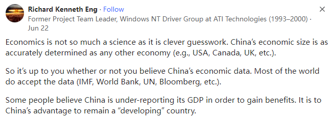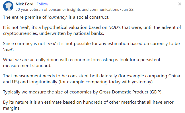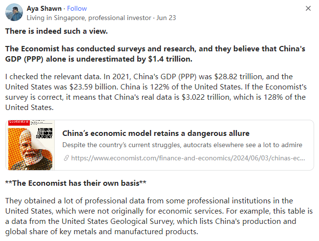 网文来自网友原文翻译投稿,所有言论皆不代表本站立场 | 本文文字/图片来自网络,侵删 | 点击页眉也可刷新 | 注册送50花瓣,每日登录送5花瓣 | 本文内容仅供娱乐,不作任何严肃之用途中国经济的规模和数据被人为压低了吗?为什么《经济学人》认为中国的经济数据被低估了?本文译自Quora,原标题:Are the current size and data of China's economy real? Why do some professional economics media believe that China's economic data is underestimated?5月30日,世界银行发布了最新一期以PPP(购买力平价)为衡量标准的各国经济总量排名。榜单显示中国以28.82万亿美元的经济总量再次位居全球首位,美国以23.59万亿美元紧随其后,印度以10.96万亿美元排名第三。这份榜单引起了《经济学人》的关注并促使他们发表了一篇长文进行解读。《经济学人》在解读中指出,即便按照PPP的方法,中国的GDP总量仍然被严重低估,他们认为真实的数据可能更高。根据《经济学人》的估算,2021年中国的GDP被低估了1.4万亿美元。如果将这1.4万亿美元加上去,中国的经济总量将达到30.22万亿美元,是美国的128%。30 year veteran of consumer insights and communications,Lives in Asia-Pacific它并不“真实”,而是一种基于“欠条”(译注:IOU,I Owe You,即“我欠你”)的假设估值,在加密货币出现之前,这些“欠条”由国家银行承保。既然货币不是“真实的”,那么所有基于货币的估算都不可能是“真实的”。在经济预测方面,我们要做的实际上是寻找一个持久的衡量标准。这种衡量标准需要在横向(例如比较中国和美国)和纵向(例如比较今天和昨天)上保持一致。就其本质而言,这是一种基于数百种其他指标的估算,而所有这些指标都有误差范围。许多经济学家认为与其他发达国家相比,中国的指标的误差范围更大。但很少有经济学家认为与过去相比,如今的中国的指标的误差范围更大。这意味着中国的GDP数字被认为在跟踪中国经济发展方面相当不错,但在将中国与其他国家进行比较方面却不太理想。对于为什么会出现这种情况,所有著名的经济学家都有不同的说法。Former Project Team Leader, Windows NT Driver Group at ATI Technologies (1993–2000),Lives in Markham, ON2013–present前ATI技术公司Windows NT驱动程序组项目组长(1993-2000年),2013年至今生活在加拿大安大略省万锦市经济学与其说是一门科学,不如说是一种巧妙的猜测。中国的经济规模与所有其他经济体(如美国、加拿大、英国等)一样,都是可以准确判断的。因此,你可以自行决定是否相信中国的经济数据。世界上大多数国家和组织(包括国际货币基金组织、世界银行、联合国、彭博社等)都接受这些数据。有些人认为中国少报GDP是为了获取利益,因为保持“发展中国家”的身份对中国有利。Living in Singapore, professional investor《经济学人》曾做过调查研究,认为单单中国的GDP(以购买力平价衡量)就被低估了1.4万亿美元。我查阅了相关数据。2021年,中国的GDP(以购买力平价衡量)为28.82万亿美元,美国为23.59万亿美元,中国是美国的122%。如果《经济学人》的调查是正确的,这意味着中国的真实数据是30.22万亿美元,是美国的128%。它们从美国的一些专业机构获得了很多专业数据,这些数据本来不是为经济服务的。例如,下面这个表格是美国地质调查局的数据,其中列出了中国主要金属和制成品的产量和全球份额。此外,它们还获得了电力行业、工业制成品、造船业、麦当劳销售数据等许多数据,并将这些非经济数据汇总在一起,以另一种方式分析和统计出了中美两国的经济规模。《经济学人》指出了中国官方GDP统计方法的缺陷:他们没有把服务业视作GDP的一部分。例如,在美国和欧洲,许多不生产“产品”的行业(如房屋租赁、法律咨询、研发投资、儿童保育等)都被算作GDP的一部分,他们通过支出来统计GDP。但在中国,他们只计算实体经济。公司必须生产汽车、玩具、服装或软件、食品等,农民或渔民必须生产大米和鱼,他们出售这些东西赚取收入,然后才会被计入GDP。中小型服务业通常不计算在内,如理发店提供理发服务,洗车店为您清洗汽车或者您将房屋出租给一对年轻夫妇,这些经济活动都不被视为GDP的一部分,几乎从未被计算在内(除非你是一家拥有数百家店铺或数十间房屋的大型企业)。世界银行的研究人员仅在中国就走访了16000家商店以收集价格数据。最新的ICP评估收集了2021年的数据,距离2017年的调查已经过去了4年。结论是中国的GDP被低估了近2万亿美元。中国国家统计局对这一结果并不满意并淡化了这一结果,称“我们需要认真解读整个结果,正确把握世界经济格局和各国经济体状况”,同时强调中国仍然是一个“发展中经济体”。《亚洲时报》认为,中国的经济数据被有意无意地操纵了。但与一些报道相反,他们认为中国在刻意隐瞒数据。“中国的GDP(以购买力平价衡量)仅比美国高25%?拜托,伙计们……我们在骗谁呢?去年,中国生产的电力是美国的两倍,钢铁是美国的12.6倍,水泥是美国的22倍。中国的造船吨位占世界的60%以上。2023年,中国生产了3020万辆汽车,几乎是美国1060万辆的三倍。事实上,中国的消费品市场在几乎所有方面都比美国大几倍”。世行调查认为,中国的GDP和GDP(以购买力平价衡量)被低估的原因是中国国民经济核算物质产品体系(MPS)转型不彻底,在设计上没有包括服务业。世行可能在调查中发现中国的商品