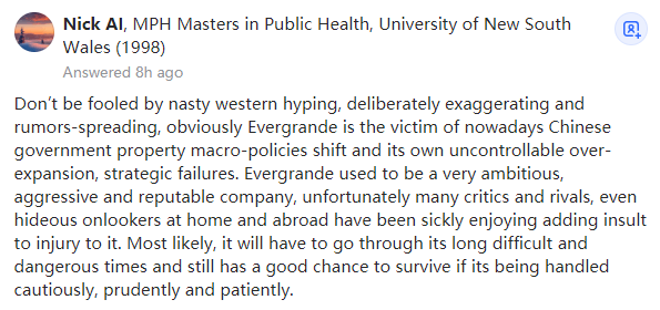 公共卫生硕士,新南威尔士大学(1998年),2017年-现在生活在悉尼不要被西方恶毒的炒作、故意夸大和谣言所愚弄,很显然,恒大是当今中国房地产宏观政策转变和自身无法控制的过度扩张、战略失败的受害者。恒大曾经是一家雄心勃勃、进取心强、信誉卓著的公司,不幸的是,许多批评者和竞争对手,甚至国内外丑陋的旁观者都在病态地享受着对它的落井下石。最有可能的是,它将不得不经历漫长的困难和危险时期,如果谨慎、耐心地处理它,它仍然有很好的活下来的机会。