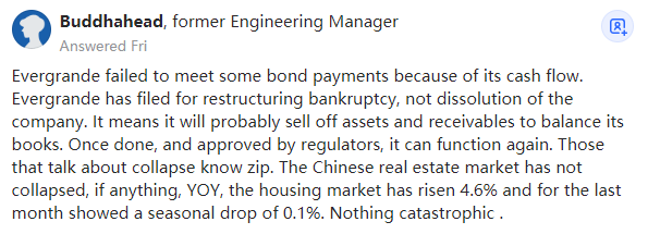 由于现金流出现问题,恒大未能兑付部分债券。恒大已申请重组破产,而不是解散公司。这意味着它可能会出售资产和应收账款,以平衡其账目。一旦完成并得到监管机构的批准,它将再次正常运营,那些谈论崩溃的人什么都不懂。中国的房地产市场没有崩盘,如果非要说有什么的话,那就是年同比上涨了4.6%,上个月的季节性跌幅为0.1%。所以没有什么灾难性的。