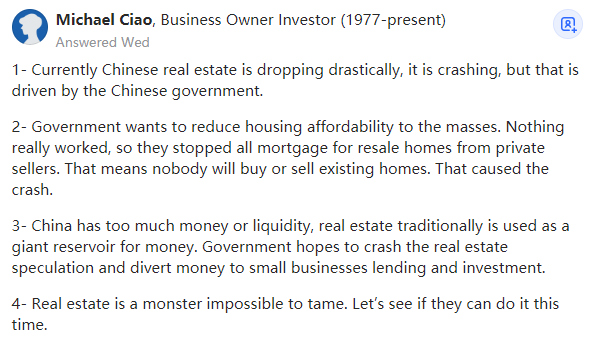 企业主,投资者(1977年至今),生活在旧金山湾区1-目前中国房地产正在急剧下跌,但这是由中国|ZF推动的。2-政府希望降低群众的住房负担,但一直未能实现,所以他们停止了所有私人卖家转售房屋的抵押贷款。这意味着没有人会买卖现有房屋,这导致了房地产市场的下滑。3-中国有太多的资金或流动性,房地产传统上被用作巨大的资金储备池。政府希望打击房地产投机,并将资金转移到小企业贷款和投资上。4-房地产是一个无法驯服的怪物,让我们看看他们这次能不能做到。5-恒大是中国最大的开发商,虽然规模巨大,但仍然只是一家公司,政府已经发出警告并予以关注,要求恒大减少债务。所有开发商都在这场由政府策划的崩溃中陷入了困境。6-恒大需要出售资产以减少其债务。这和万达以及海航几年前做的一样,现在它们都更健康了。恒大的案例并非史无前例,类似的情况中国经历过多次。感谢诸位亲的相伴与支持,由于个别文章的用词和地图使用不规范,全部文章会在审核整理之后陆续上架,新翻译的文章会特别标注,未做标注的为发布过的文章。为避免误点收费文并祝大家新年快乐,所有1月17日之前注册的用户均已获赠1000花瓣,敬请查收。每日登陆送5花瓣 | 联系方式:QQ-1399710240 ,有任何问题请发邮件或者加QQ。