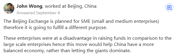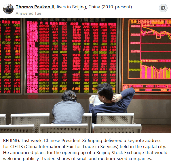 网文来自网友原文翻译投稿,所有言论皆不代表本站立场 | 本文文字/图片来自网络,侵删 | 点击页眉也可刷新 | 本文内容仅供娱乐,不作任何严肃之用途北交所来了!!中国为什么突然之间要在北京新建立一家证券交易所?本文译自Quora,原标题:What do you think about China planning to create a stock exchange in Beijing?9月2日晚,国家主席习近平在2021年中国国际服务贸易交易会全球服务贸易峰会上发表视频致辞。习近平强调,中国将提高开放水平,在全国推进实施跨境服务贸易负面清单,探索建设国家服务贸易创新发展示范区;扩大合作空间,加大对共建“一带一路”国家服务业发展的支持,同世界共享中国技术发展成果;加强服务领域规则建设,支持北京等地开展国际高水平自由贸易协定规则对接先行先试,打造数字贸易示范区;继续支持中小企业创新发展,深化新三板改革,设立北京证券交易所,打造服务创新型中小企业主阵地。