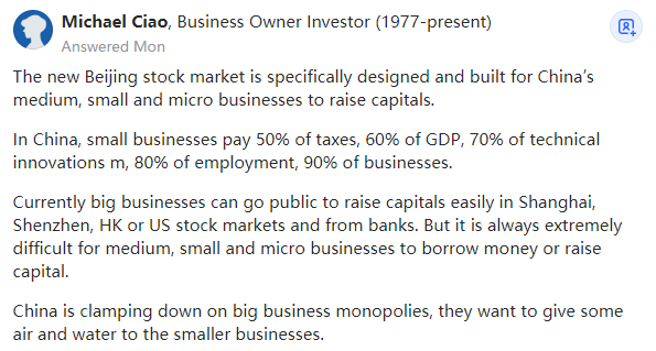 企业主,投资者(1977年至今),生活在旧金山湾区新的北京证交所是专门为中国的中小微企业融资而设计和建立的。在中国,小企业创造了50%的税收,60%的GDP,70%的技术创新,80%的就业,占企业总数的90%。目前,大型企业可以在上海、深圳、香港或美国股市上市,或者可以从银行轻松筹集资金。但对于中小微企业来说,借钱或筹集资金一直都是极其困难的。中国正在打击大企业的垄断,他们想给小企业一些生存空间。
