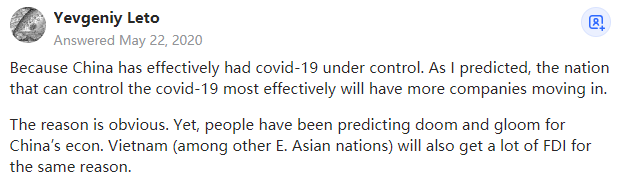 因为中国实际上已经控制了新冠病毒。正如我所预测的,能够最有效地控制新冠病毒的国家将会有更多的公司进入。原因显而易见。然而,人们一直预测中国经济的前途暗淡。越南(以及其他东亚国家)也出于同样的原因有望获得大量的外国直接投资。