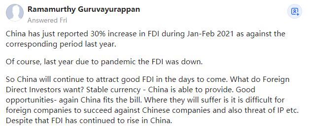 网文来自网友原文翻译投稿,所有言论皆不代表本站立场 | 本文文字/图片来自网络,侵删 | 点击页眉也可刷新 | 本文内容仅供娱乐,不作任何严肃之用途2020年中国的外国直接投资(FDI)首次超过美国,大流行结束后能继续保持这一势头吗?本文译自Quora,原标题:Will direct foreign investment rise a lot in China after the end of Covid 19?Retired Medical Professional, Anti Nuclear Peace activist,Lives in Kuala Lumpur, Malaysia