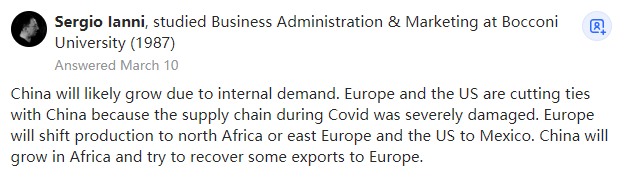 中国经济可能会因为内需而增长。欧洲和美国正在切断与中国的联系,因为在大流行期间供应链受到了严重的破坏。欧洲将把生产转移到北非或东欧,美国将转移到墨西哥。中国将在非洲加大投入,并试图部分恢复对欧洲的出口。Wer immer strebend sich bemüht, Den können wir erlösen.
