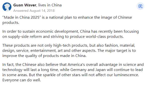 为了保持经济发展,中国最近一直致力于供给侧改革,努力生产世界级的产品。这些产品不仅包括高科技产品,还涉及时尚、材料、设计、服务、娱乐、艺术等方面,主要的目标是提高中国制造的产品质量。事实上,中国人也相信美国在科技方面的整体优势将继续维持很长时间,而德国和日本将在某些领域继续领先,但是其他恒星的光芒不会影响我们发光,每个人都能做得很好。