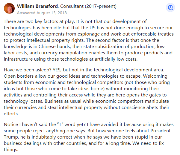Consultant (2017-present),Lives in Jacksonville, FL Greater Metropolitan Area2014–present顾问(2017年至今),2014年至今生活在佛罗里达州Metropolitan大区有两个关键的因素在起作用。并不是因为我们的技术开发一直处于懈怠状态,而是因为美国在确保我们的技术开发不受间谍活动的影响以及制定保护知识产权的可执行条约方面做得不够。第二个因素是一旦知识掌握在中国人手中,他们的国家生产补贴、低廉的劳动力成本和货币操纵使得他们能够以人为的低成本生产使用这些技术的产品和基础设施。