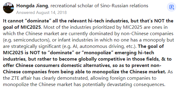 recreational scholar of Sino-Russian relations中国不会“主宰”所有相关的高科技产业,这不是《中国制造2025》的目标。《中国制造2025》优先考虑的大多数行业是中国市场上目前由非中国公司主导的行业(如半导体),或无人垄断但具有战略意义的新兴行业(如人工智能、自动驾驶等)。《中国制造2025》的目标不是“主宰”或“垄断”新兴高科技产业,而是在这些领域具备全球竞争力并为中国消费者提供国内替代品以防止非中国公司垄断中国市场,因为中兴事件清楚地表明允许外国公司垄断中国市场具有潜在的毁灭性后果。
