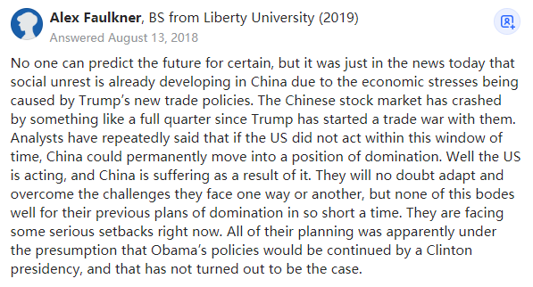 BS from Liberty University (2019)没有人能够确切地预测未来,但就在今天的新闻中,由于美国的新贸易政策造成的经济压力,中国已经出现了社会动荡。自从美国与中国展开贸易战以来,中国股市已经暴跌了整整一个季度。分析人士一再表示,如果美国不在这个时间窗口内采取行动,中国可能会永久性地占据主导地位。美国正在采取行动,而中国正因此而受苦。毫无疑问,他们将以某种方式适应和克服他们所面临的挑战,但所有这些对他们之前希望在如此短的时间内称霸的计划来说都不是好兆头。他们现在正面临一些严重的挫折。