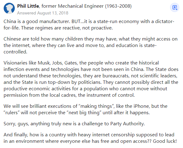 中国人被告知他们可以有几个孩子,他们能在互联网上看什么内容,他可以在哪里生活,可以搬到哪里去,连教育都是被国家控制的。像马斯克、乔布斯、盖茨这样的有远见的人,那些创造历史性拐点事件和技术的人在中国从未出现过。中国的政府高层不了解这些技术,他们是官僚而不是科学领袖。中国由政客自上而下管理,他们不可能指导民众所有的生产性经济活动,因为没有地方干部(控制工具)的许可,民众是无法流动的。我们将看到“创造事物”(making things)的精彩表演,比如iPhone,但“统治者”在“下一件大事”发生前不会意识到它的存在。抱歉,伙计们,任何真正新的事物都是对党的权威的挑战。最后,一个拥有严密互联网审查的国家如何能够在其他人都可以自由和开放访问的环境中发挥领导作用?祝你好运!