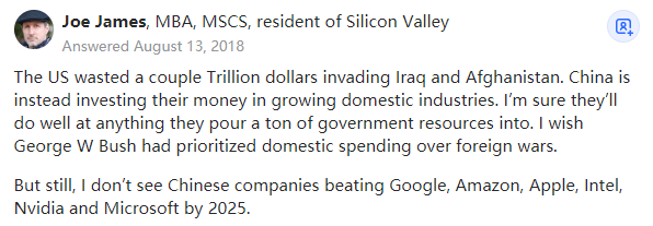 但到2025年,我看不到有能打败谷歌、亚马逊、苹果、英特尔、英伟达和微软的中国公司。