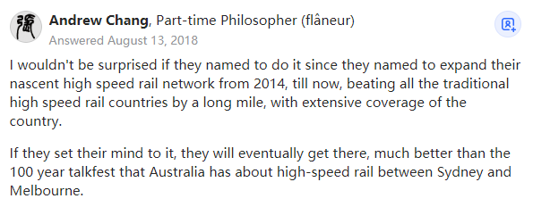 Part-time Philosopher (flâneur)如果他们下定决心要这样做,我不会感到惊讶,因为他们曾下定决心从2014年开始扩大其新兴的高铁网络,其结果是他们比所有其他传统的有高速铁路国家领先太多,覆盖范围也更广泛。
