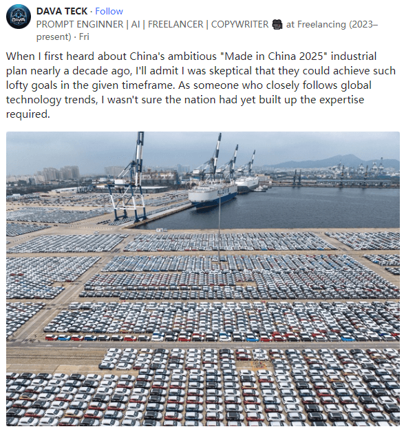 中国制造2025实现了吗?从质疑到钦佩,是时候承认中国在全球创新舞台上取得的成就了本文译自Quora空间,原地址:https://www.quora.com/profile/DAVA-TECKPROMPT ENGINNER | AI | FREELANCER | COPYWRITER �� at Freelancing (2023–present),Lives in Canada2024–present提示工程师|人工智能|自由职业者的女记者(2023年至今),现居加拿大近十年前,当我第一次听说中国雄心勃勃的“中国制造2025”计划时,我承认我对他们能否在既定时间内实现如此崇高的目标持怀疑态度。作为一个密切关注全球技术趋势的人,我不确定中国是否已经积累了所需的专业知识。然而,在研究了他们的最新进展后,我不得不说我不仅印象深刻,而且非常震惊!从主导全球造船业到引领可再生能源发展,中国显然在战略性产业上投入了大量的资源。作为一名狂热的太空探索爱好者,得知他们最近一次成功地在中国空间站上进行乘员轮换,我感到非常高兴。即使面对地缘政治逆风,谁又能否认华为等本土科技巨头的惊人的主导地位呢?不过,也许没有什么能比那张令人大开眼界的电动汽车产量对比图更能让人明白这一点了。看来,曾经看似遥远的“2025年愿景”已成为今天的现实。中国展示了通过集中投资和国家意志力所能实现的目标,这值得称赞。他们在如此短的时间内取得的成就令人惊叹。这恰恰说明只要政界和私营部门步调一致,就能取得巨大的进步。虽然多年前我们曾对中国的发展持怀疑态度,但现在是时候承认中国在全球创新舞台上取得的成就了。为他们改写规则而喝彩!中国正在取代美国的军事工业复合体,这将使他们成为新的军事工业复合体。不太可能。美国的军事工业复合体已使美国成为一个追求战争利益的国家,出售更多武器是这些军事工业复合体的商业本质。如果世界和平,武器的销量就会下降,所以美国军事工业复合体的高管会轮流进入白宫以确保政客们为军事工业复合体的利益服务,埃斯彭和奥斯汀就是典型的例子。中国将出售更多的基础设施项目,这是一项难度更大、利润率更低的工作。哈哈!中国的军事工业公司对中国政府没有任何影响力,他们只是快乐的供应商,而美国的军事工业复合体会通过游说(即贿赂)让美国在世界各地实施暴力以获取利润。当然,因为他们不需要在研究上花钱,他们只需窃取一切就可以了。今天这已经成为现实,因为现在是2024年,只要中国把事情做好,《中国制造2025》就会成为现实。两年前,我看过一些YouTube频道,当时中国的停车场里停满了电动汽车,很多甚至被开进了垃圾场。原因很简单--每生产一辆电动汽车,中供就会给汽车制造商一笔钱,他们并不关心电动汽车会发生什么。今天,我读到欧盟的港口如何被停在港口超过一年的中国电动车堵塞!谁会买一辆停放了一年以上的电动车?电池都快没电了,因为我怀疑他们是否会定期给电池充电。我从多个渠道了解到中国人只是把电动车运到港口,卸下就走。他们没有与运输公司或经销商做任何交易,而运输公司已经超额预定,它们没有资源将电动汽车从港口运到经销商手中。再加上电动汽车销量下降了40%...家电或电脑公司开始生产电动汽车简直是疯了。电动汽车制造商正在大量倒闭,最后只会剩下少数几家,这也印证了上述观点。这看起来更像是GCD人在吹嘘他们如何在生产目标上创造新纪录,无论是否有任何需求......中国不是指令性经济,其工业产出是由市场驱动的。例如,如果这些汽车卖不出去,中国就不会在2023年生产出3000万辆汽车。事实上,中国是世界上大多数工业产品的最大的市场。你知道电动汽车的大规模生产得到了中国政府同样大规模补贴的支持吗?他们有五年计划,他们会通过影响税收和政府投资来设定工业目标。作为环保政策的一部分,美国、欧洲和大多数其他工业国家的政府也会在电动汽车的早期阶段给予补贴,以鼓励消费者购买电动汽车。例如,几年前我购买特斯拉Model 3时,就从美国政府那里得到了一张5000美元的支票,另外还有几千美元的退税。因此,请不要单独针对中国。事实上,由于中国民众大量采用电动汽车,中国正在逐步取消大部分补贴。你们的政府在制定崇高目标和动员民众实现目标方面效率不高,因此只能通过找茬和宣传来转移人们对其不足之处的注意力。你不妨多长点脑子(gray cell),问问所谓的西方国家的人权记录如何。美国和英国是两个臭名昭著的践踏人权者,它们习惯于说教和教训他人。最近发生的事件、乌克兰战争和加沙的种族灭绝肯定不是人权的光辉典范。相反,这是肮脏的有钱人从武器销售中获利的可耻骗局。你需要关注中国正在发生的变化。那些港口被电动车堵塞,它们根本卖不出去。我拥有电动汽车已有9年,我看到了泡沫的膨胀。中国的房地产是世界末日,以至于资金通过许多隐蔽的渠道流入了美国。中国公司正处于危机之中,同时它们也在输出危机。数百年来,所有重商主义国家的终结者都是外国投资,这就是泡沫破裂的地方。是的,中供已经达到了过度生产所有东西的地步,而那些制造它们的技术,都是西方转让和赠送给他们的。然而,正如图片中描绘的那样,从无人居住的公寓到无人问津或买不起的电动车,这些过度生产的电动车将被送进坟墓。毕竟,这是在金钱补贴下,为了向《中国制造2025》发起出口攻势而建造的越来越多的产品。补贴助推电动车热潮后,中国废弃的电