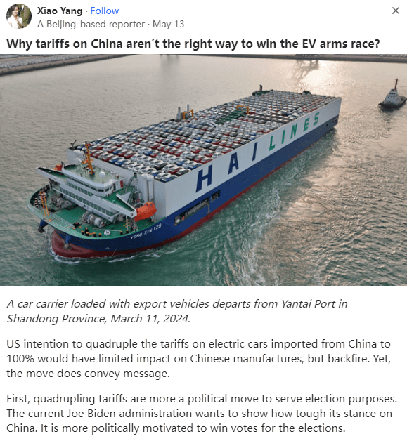 Quora:美国将中国电动汽车关税提高到100%,为什么高关税不是赢得电动汽车军备竞赛的正确方式?本文译自Quora,原标题:Why tariffs on China aren’t the right way to win the EV arms race?5月14日,美国政府宣布将对中国电动汽车等产品加征关税。美国此次针对中国商品加征的关税涵盖多个领域,生效时间从2024年到2026年不等。在电动汽车、电池、电池零部件和关键矿物领域,2024年,电动汽车关税将从目前的25%提升至100%,叠加美国针对电动汽车征收的2.5%基础关税,最终税率将达到102.5%;电动汽车锂电池关税税率将从7.5%提高到25%;电池零部件的关税税率将从7.5%提高到25%;某些其他关键矿产的税率将从0%提高到25%。其中,部分措施将在2026年生效。非电动汽车锂电池关税税率将从7.5%提高到25%,天然石墨和永磁体的关税税率将从0%提高到25%。美国宣称,新措施将影响价值180亿美元自中国进口的商品。为什么对中国征收关税不是赢得电动汽车军备竞赛的正确方式?2024年3月11日,一艘满载出口汽车的汽车运输船从山东烟台港出发。美国打算将从中国进口的电动汽车的关税提高四倍至100%,这对中国制造商的影响有限,但会产生适得其反的效果。然而,此举确实传达了一些信息。首先,将关税提高四倍更多的是为选举服务的政治举措。目前的乔-拜登政府希望展示其对中国的强硬立场,其政治动机更多的是为选举赢得选票。其次,中国出口到美国的乘用车主要是美国品牌(但在中国生产),中国品牌的电动汽车对美国的出口几乎为零。向美国市场出口电动汽车的中国品牌寥寥无几,增加关税将使美国公司和消费者蒙受更多损失,这是美国不得不接受的不争的事实。第三,提高关税意味着即使征收25%的关税,美国制造的电动汽车与从中国进口的电动汽车相比,在性价比方面也不占优势。这也意味着美国制造业处于守势,只能通过高关税来维持国内产业的发展。提高关税显示了美国的焦虑以及对本国产业竞争力的不安,这无助于赢得竞争。中国的电动汽车的价格为10000美元,征收100%的关税之后为20000美元,而美国最便宜的电动汽车价格在25000美元以上。看来,中国更感兴趣的是剥夺美国的信誉。美国正在走向 “反全球化”,因为中国现在正在运输美国无法与之竞争的汽车和高科技通讯设备,因此这引发了美国在国家安全方面的担忧(别管FACEBOOK、苹果、亚马逊、谷歌、Instagram等这些世界知名的公司是否在收集用户数据以获得更好的体验)。竞争会激发创新和创造力,让消费者以更低的产品价格获得更多选择,这不是全球化的口号吗?哈哈。但全球自由贸易一定是好事吗?我的总体看法是全球自由贸易会导致竞争过于激烈,工人阶级和底层人民的生活条件会受到很大的压力,同时也会给资本家带来很大的权力,因为他们可以很容易地转移到税收最低、工资最低廉的地方。我认为消费者应该支付更多的钱,因为在发达国家,人们已经消费了太多的垃圾,而更高的价格将导致更合理的消费。再看一遍标题--我们讨论的是对中国电动汽车征收关税的问题,因为中国电动汽车制造商从中国政府获得了大量的直接补贴。2023年,比亚迪获得了约37亿美元的政府直接补贴,这是中国政府推动电动汽车主导地位的一部分,这可不是全球自由贸易。美国每年为电动汽车提供数十亿美元的补贴,但当中国在电动汽车竞赛中获胜时,电动汽车就成了一个负面词汇。不,这是两个完全不同的概念。中国政府向中国电动汽车制造商提供直接补贴,这实际上降低了该公司生产的每辆电动汽车的生产成本。而在美国,补贴是以税收优惠的形式提供给美国买家的。因此,如果汽车出口到其他国家,美国的税收激励措施对汽车成本没有影响。福特公司获得92亿美元的补贴以帮助美国赶上中国的电动汽车主导地位但正如我所说,当美国在电动汽车竞赛中输给中国时,电动汽车就成了一个负面词汇。我的理解是中国政府向比亚迪提供的补贴是现金注入而不是贷款,而美国政府对福特的补贴是必须偿还的贷款。此外,给福特的贷款是一次性的,而给比亚迪的现金注入预计是经常性的。如果我的理解正确的话,这完全是两码事,对自由贸易的经济影响也大相径庭。我看你是在玩文字游戏,以“自由贸易”作为结尾真是有趣,笑死我了。正如绝望的美国现实政治所展示的那样,只要美国的霸权得到维护,“自由贸易”就会存在,否则,一切都只为了自己。在“贷款”之后,还有“纾困”,很难说一个的结束和另一个的开始。如果您愿意点击我发布的第二个链接,你可以看到许多关于“赠款”的内容,金额高达数十亿美元。Ø美国汽车工业的历史之都密歇根州于12月通过了一项15亿美元的法案,扩大了州政府的激励措施,包括对电动汽车生产的激励措施Ø拜登政府试图在全国范围内为电动汽车生产提供补贴,提议为汽车厂的改造提供35亿美元的补助金但正如我所说,当美国在电动汽车竞争中输给中国时,电动汽车就成了一个负面词汇,这与“自由贸易”的命运是一样的。让我们看看欧洲的情况。我们听说欧洲最大的港口都堆满了中国的电动车,因为没人要!中国只是把电动车运到欧盟,停好就走。中国的汽车制造商甚至没有与汽车经销商达成协议,它们甚至没有与将电动汽车运往汽车经销商的公司达成协议!有消息称许多汽车已经停放了18个月!这样的车已经不能再开了。那么,又
