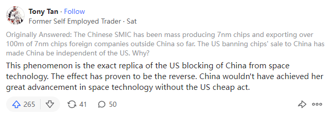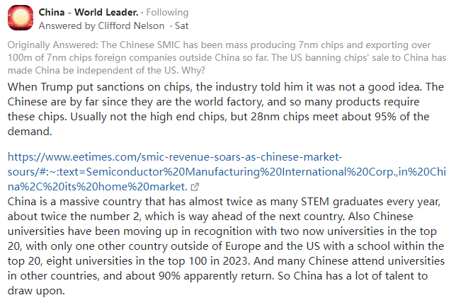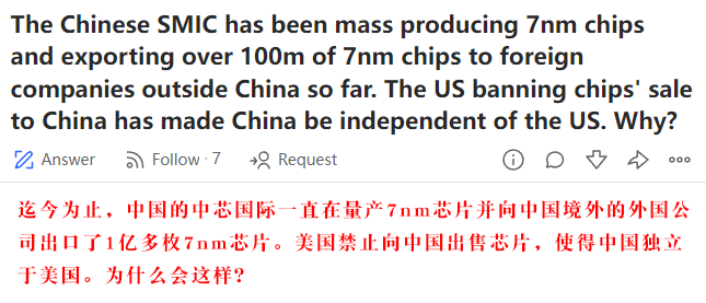 本文译自Quora,原标题:The Chinese SMIC has been mass producing 7nm chips and exporting over 100m of 7nm chips to foreign companies outside China so far. The US banning chips' sale to China has made China be independent of the US. Why?