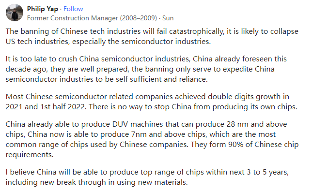 现在打压中国半导体产业为时已晚,因为中国早在十年前就已经预见到这些,他们已经做好了充分的准备,这一禁令只会加速中国半导体产业实现自给自足和自力更生的过程。