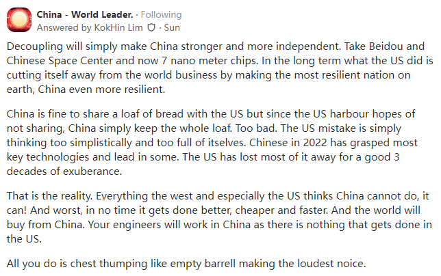脱钩只会让中国变得更强大、更独立,北斗导航系统和中国航天以及现在的7nm芯片就是例子。从长远来看,美国所做的是让世界上最具弹性的国家——中国——变得更具弹性,从而将自己与世界商业割裂开来。