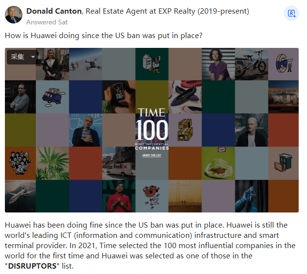 自从美国禁令实施以来,华为一直表现良好。华为现在仍然是全球领先的ICT(信息和通信)基础设施和智能终端提供商。2021年,《时代》杂志首次评选出全球最具影响力的100家公司,华为被选为“颠覆者”之一。