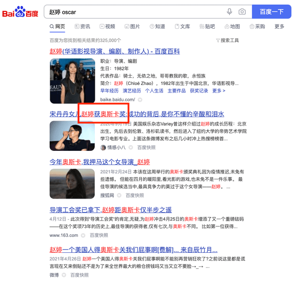 啥?百度搜索的第二个结果就是,就在她的百度百科之后。(译注:这里说的是因《无依之地》获三项奥斯卡最佳影片,最佳女主,最佳导演的赵婷)