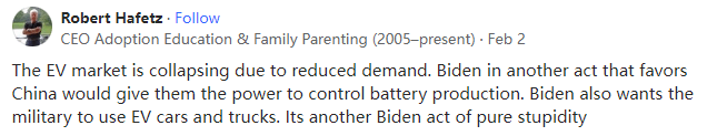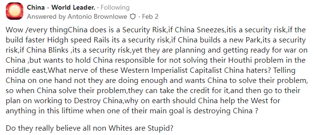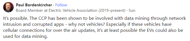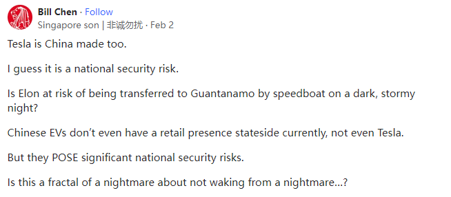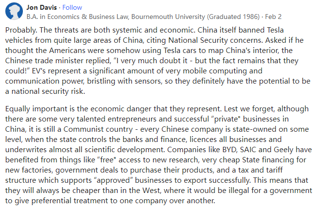 本文译自Quora,原标题:US Commerce Secretary Gina Raimondo warned that Chinese-made electric vehicles pose significant national security risks, as the Biden administration weighs additional tariffs on autos. Will China's EV become another Huawei?CEO Adoption Education & Family Parenting (2005–present)由于需求减少,电动汽车市场正在崩溃。拜登在另一项有利于中国的行动中将赋予中国控制电池生产的权力(拜登还希望军队使用电动汽车和卡车),这是拜登的又一愚蠢之举。Board Member at Electric Vehicle Association (2019–present)有可能。中供已被证明通过网络入侵和损坏的应用程序参与了数据盗窃--为什么不通过车辆呢?尤其是如果这些车辆有用于无线更新的蜂窝连接,那么电动汽车至少也有可能被用于数据盗窃。B.A. in Economics & Business Law, Bournemouth University (Graduated 1986)有可能吧。中国的威胁既是体制性的,也是经济性的。中国以国家安全为由禁止特斯拉汽车在中国相当大的地区行驶,当被问及是否认为美国人在利用特斯拉汽车绘制中国内陆地图时,中国贸易部长回答说:“我非常怀疑 - 但事实仍然是他们可以!”电动汽车拥有巨大的移动计算和通信能力并装满了传感器,因此它绝对有可能成为国家安全的隐患。同样重要的是中国所代表的经济危险。我们不要忘记虽然中国有一些非常有才华的企业家和成功的“私营”企业,但它仍然是一个GC国家--每家中国公司在某种程度上都是国有企业,国家控制着银行和金融,为所有企业发放许可证并几乎包揽了所有的科学发展。比亚迪、上汽和吉利等公司都受益于“免费”获得新研究成果、国家为新工厂提供非常便宜的融资、政府购买其产品的交易以及支持“获批”企业成功出口的税收和关税结构。这意味着它们的价格永远比西方便宜,而在西方,政府给予一家公司优于另一家公司的待遇是违法的。华为是一家坚称自己的手机基础设施销售不会对西方构成威胁的私营企业。然而,除了中国政府已经给予它们的经济优势外,虽然华为可能实际上并没有利用它们提供的手机基础设施来破坏或监视西方,但正如中国贸易部长在谈到特斯拉时所说的那样,事实是它们有这样做的能力!哇!中国做的每一件事都是安全风险,如果中国打喷嚏,它是安全风险;如果中国建造更快的高速铁路,它是安全风险;如果中国建造一个新的公园,它是安全风险;如果中国眨眨眼,它也是安全风险。然而,当它们正在计划和准备对中国发动战争时,却想让中国为它们在中东没有解决的胡塞问题负责,这些西方帝国主义资本主义的仇华者脑子出了什么?他们一方面告诉中国做得不够好,希望中国解决他们的问题,当中国解决了他们的问题,他们就可以把功劳据为己有,然后继续他们的计划,努力摧毁中国,既然他们的主要目标之一是摧毁中国,中国究竟为什么要在这个时候帮助西方做任何事情?埃隆是否有在漆黑的暴风雨之夜乘快艇被转移到关塔那摩的风险?中国的电动汽车目前在美国没有零售业务,甚至特斯拉也没有。这是一场无法从噩梦中醒来的噩梦的分形吗......?专业提示:如果美国以国家安全为借口为某些事情辩解,那99%是扯淡。这是笛卡尔“我思故我在”(Cogito, ergo sum)的怪异变体,只是我怀疑雷蒙多是否知道笛卡尔是谁。她的嘴和她说的话也是一个国家安全问题。唯一不同的是她的声音更大,她控制着叙事。中国不允许特斯拉汽车进入大城市的一些区域,因为它们是一种安全威胁。这些汽车是由一家美国公司在中国制造的,但中国却让它们在许多城市无法使用以将这家美国公司赶出中国。但是,可爱无辜的中国用大规模的进口关税、进口限制和对所有非中国公司的使用限制来回应,这公平吗?我同意,说实话,拜登他们正在阻止进口中国的电动汽车,除非中国开放市场,然后我们再谈。标准普尔500指数公司每年从中国业务中赚取超过1万亿美元的收入,这在中美贸易数据中并没有体现。中国对进口汽车征收17%至47%的关税,再加上17%的税收,再加上进口数量限制,再加上以“国家安全”为由不允许特斯拉进入大多数城市的核心区并对许多其他产品类别也有类似的进口限制,这些都是事实,并非无稽之谈。仅仅因为你能举出一家公司的名字(这家公司的许多业务因国家安全法而减少或关闭,但它确实在中国赚取了部分利润)就能想证明中国是一个开放、互惠的市场吗?世界其他国家并不像你的帖子那样被中国的宣传所淹没,我们了解现实。所以国家安全在美国是不公平的,但在中国就是了?在有色眼镜后面的所有东西都会立即被中供化......确实有极少数地方限制特斯拉的行驶,但一般都是军事基地附属建筑等机密场所。对于普通人来说,他们感受不到这种限制,这一点你可以从特斯拉的销量上看出来,上个月特斯拉在中国卖了94139辆车,人们根本不会买一辆无法开到核心城区的车。总的来说,你根本看不到中国有任何贸易保护。恰恰相反,特斯拉在上海建厂时中国给予了马斯克前所未有的优惠条件,而这正是为了增加国内市场的竞争。我认识至少三个开特斯拉的人,其中两个是同事,一个是邻居,当我向他们询问此事时,他们都说听说过,但根本没遇到过。根据中国发言人的说法,特斯拉汽车禁止进入军事基地和安全区、主要党政机关单位等禁区。我认为如果美国对中国电动汽车采取类似的限制措施而不是全面禁止并推动其他西方国家效仿,