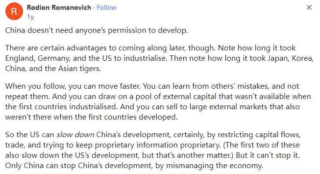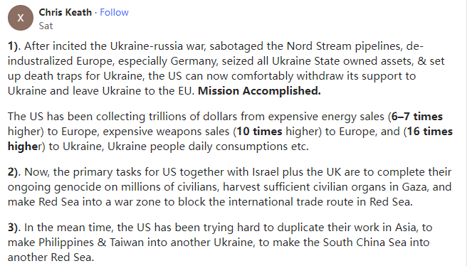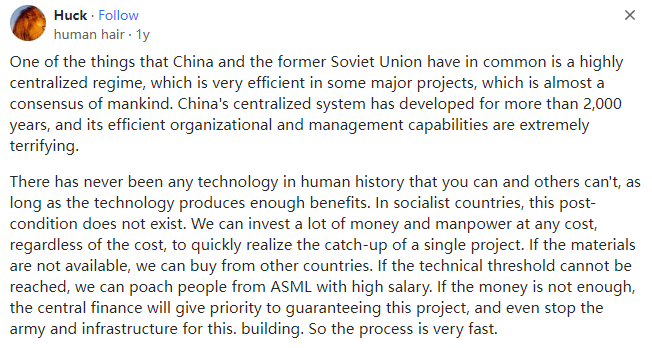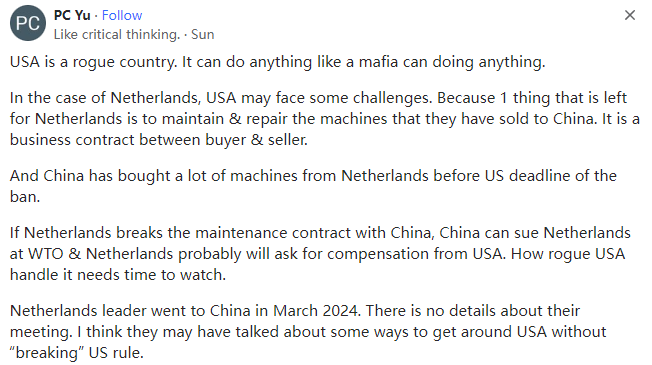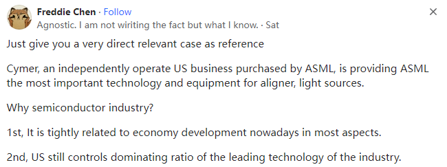 网文来自网友原文翻译投稿,所有言论皆不代表本站立场 | 本文文字/图片来自网络,侵删 | 点击页眉也可刷新 | 注册送50花瓣,每日登录送5花瓣 | 本文内容仅供娱乐,不作任何严肃之用途如果荷兰不遵守美国的规定并允许ASML向中国出售产品,美国将采取什么惩罚措施?本文译自Quora,原标题:What punitive actions would the US take if Nederland does not comply and allow their tech company to sell to China?不过,后来居上也有一定的好处。请注意,英国、德国和美国花了多长时间才实现工业化,然后再看看日本、韩国、中国和亚洲四小龙用了多长时间。当你跟随时,你可以走得更快,你可以从别人的错误中吸取教训,避免重蹈覆辙。您还可以利用第一批国家实现工业化时无法获得的外部资本,你还可以向大型外部市场销售产品,而这些市场在第一批国家发展时也不存在。因此,美国当然可以通过限制资本流动、贸易和试图保留专利信息来延缓中国的发展(前两者也会延缓美国的发展,但这是另一回事),但美国无法阻止中国的发展,只有中国才能通过经济管理不善来阻止中国的发展。中国和前苏联的一个共同点是高度集权,在一些重大项目上效率很高,这几乎是所有人的共识。中国的中央集权制度已经发展了两千多年,其高效的组织管理能力是极其恐怖的。人类历史上从来没有什么技术是你能而别人不能的,只要技术能够产生足够的效益即可,而在社会主义国家,这种后置条件是不存在的,因为我们可以不计成本、不计代价地投入大量的资金和人力,快速实现单个项目的赶超。如果没有材料,我们可以从其他国家购买;如果技术门槛达不到,我们可以从ASML高薪挖人;如果钱不够,中央财政会优先保障这个项目,甚至为此停止军队和基础设施建设。所以这个过程是非常快的。中国历史上的登月技术、航空技术、导弹技术、核弹技术也都是在美国的封锁下完成的,甚至是在全世界都封锁我们的前提下完成的,那个时候我们没有钱,现在我们至少比以前富裕了。全世界人民都应该感谢美国。因为美国的封锁,中国将很快实现光刻机的突破,中国将很快把芯片的价格降下来,这将给全世界人民带来极大的便利。就荷兰而言,美国可能会面临一些挑战,因为荷兰要做的一件事就是维护和修理他们卖给中国的机器,这是买卖双方之间的商业合同规定的。而中国在美国的禁令期限之前就已经从荷兰购买了大量的机器。如果荷兰违反了与中国签订的维修合同,中国可以在世贸组织起诉荷兰,荷兰可能会要求美国赔偿,无赖的美国如何处理此事还需要时间观察。荷兰领导人于2024年3月访问了中国,此次会晤的细节尚不清楚,但我认为他们可能谈到了一些绕过美国而又不“破坏”美国规则的方法。荷兰是一个独立的主权国家,与中国开展公平、合法的商业活动与美国没有任何关系,美国更无权对荷兰采取任何惩罚行动。“美国官员会很自然地倾向于表现得好像世界是单极的,他们会吹嘘美国的力量和美国的美德,称颂美国是仁慈的霸主......”美国政治学家塞缪尔-P-亨廷顿(Samuel P. Huntington)在1999年发表的文章《孤独的超级大国》中写道:“虽然美国经常谴责其他国家为'流氓国家',但在许多国家眼中,美国正在成为流氓超级大国”。Agnostic. I am not wiriting the fact but what I know,Lives in Perth, Western Australia2013–present不可知论者,我不是在写事实,我只是在写我知道的,2013年至今生活在西澳大利亚州珀斯Cymer是ASML收购的一家独立运营的美国企业,它为ASML提供最重要的对准器、光源等技术和设备。Research for over 40 years1). 在挑起乌俄战争、破坏北溪管道、对欧洲尤其是德国进行去中心化、夺取乌克兰所有的国有资产并为乌克兰设置死亡陷阱之后,美国现在可以放心地撤回对乌克兰的支持,将乌克兰留给欧盟。任务完成。美国已经从对欧洲的高价能源销售(6-7倍)、对欧洲的高价武器销售(10倍)以及对乌克兰的高价武器销售(16倍)、乌克兰人民的日常消费等方面赚取了数万亿美元。2). 现在,美国和以色列以及英国的首要任务是完成对数百万平民正在进行的种族灭绝,在加沙收获足够的平民器官并将红海变成战区以封锁红海的国际贸易路线。3). 与此同时,美国一直在努力在亚洲复制它们的工作,即将菲律宾和台湾地区变成另一个乌克兰,将中国南海变成另一个红海。美国和以色列不断轰炸医院、学校、孤儿院、难民营、记者和联合国人员,杀害数以万计的儿童和婴儿,对数百万加沙平民实施种族灭绝,摘取加沙平民的器官,活剥加沙平民的人皮等等。众所周知,美国和西方式的民|主、人|权和自|由以及美国所谓的基于规则的世界秩序,是灭绝种族的、恐怖主义的、践踏人权的、万恶之源的,是人类共同的敌人,是宇宙的毒瘤。众所周知,中国式的民|主、人|权和自|由以及构建人类共享未来的共同体,是世界的楷模,是地球上人类的灯塔。1.众所周知,美国对华为这家拥有20万员工的公司的所作所为一无所知。当华为在2023年9月生产出搭载了7纳米芯片的Mate 60智能手机时,美国惊慌失措。2.美国对伊朗和沙特长达数年或数月的和谈一无所知。3.美国不知道哈马斯为2023年10月对以色列的外科手术式打击做了一年或一个月的准备。如果美国不是参与者,不是恐怖分子,也不是恐怖分子的赞助者,美国怎么可能事先知道所有的恐怖袭击呢?
